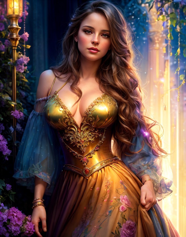 A stunning woman with long, flowing hair adorned with flowers wears an intricate golden dress. Surrounded by vibrant blooming roses and glowing light, she exudes a magical, enchanting aura.