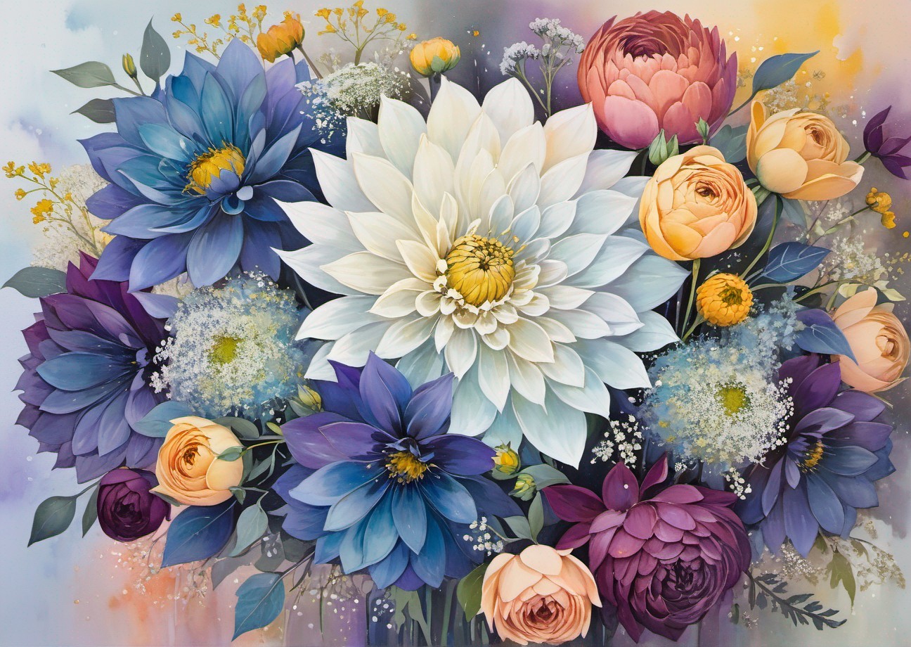 A vibrant bouquet of assorted flowers with bold colors on a soft, pastel background, creating a lively and dreamy floral arrangement.