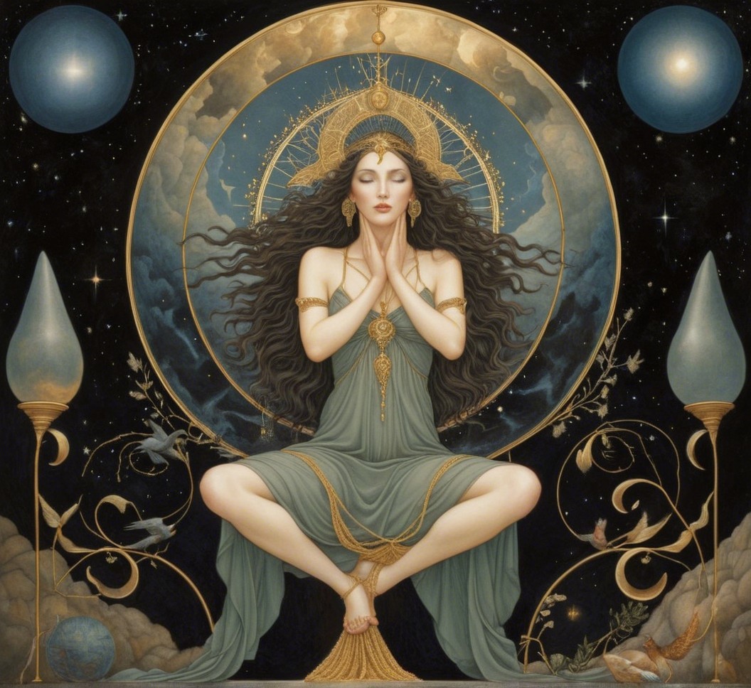 The artwork features a serene woman in a flowing dress, seated with hands in a prayer position, surrounded by celestial elements like moons and stars, evoking a sense of tranquility and spirituality.