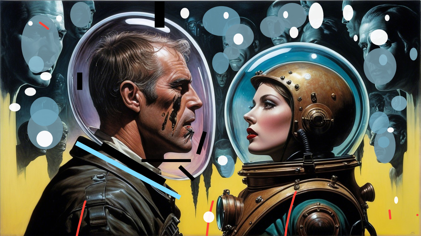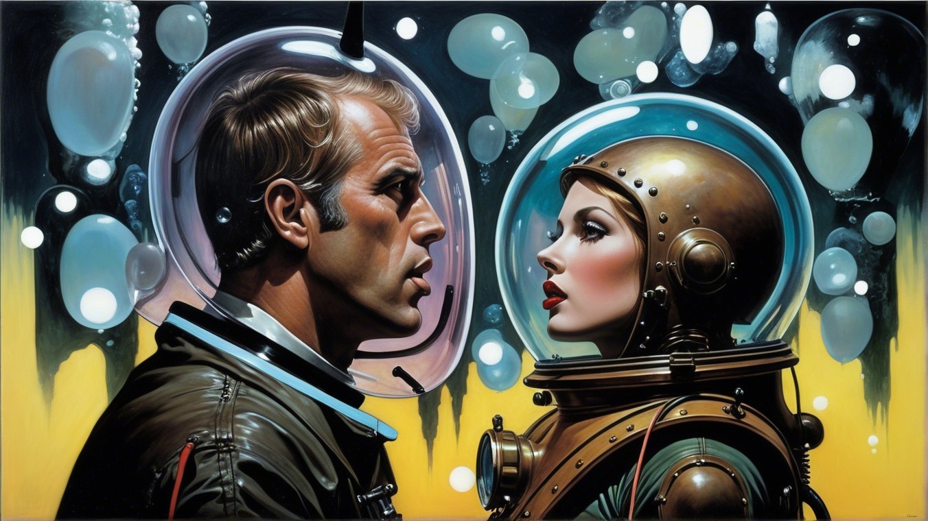 A close-up of a man and woman in retro astronaut suits, facing each other. Their expressions convey tension, surrounded by translucent bubbles against a vibrant, abstract background.