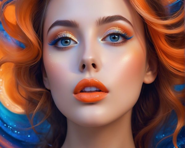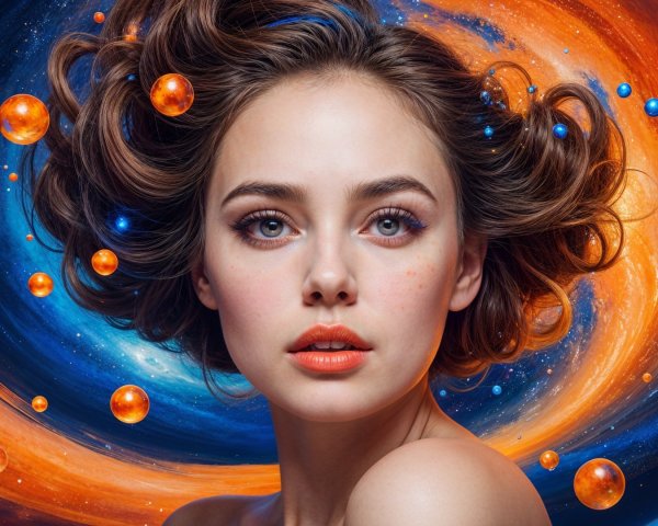 A striking portrait of a woman with captivating blue eyes and vivid orange hair, set against a cosmic backdrop filled with colorful celestial elements and ethereal swirls of stars.