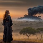 A woman in a flowing black gown stands on a rocky ledge, gazing at a dramatic sunset. Smoky clouds rise from a distant hill, contrasting with the golden sky and lush, misty landscape.