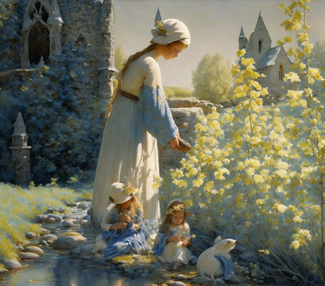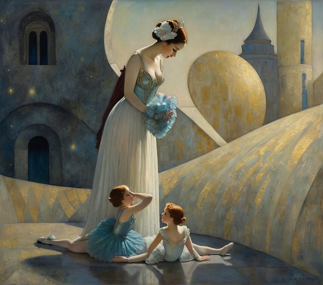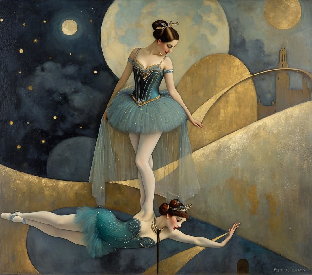 A graceful ballerina dances on a swirling landscape under a starry night sky. Her elegant blue tutu and poised stance embody a sense of beauty and harmony, evoking dreams and artistry.