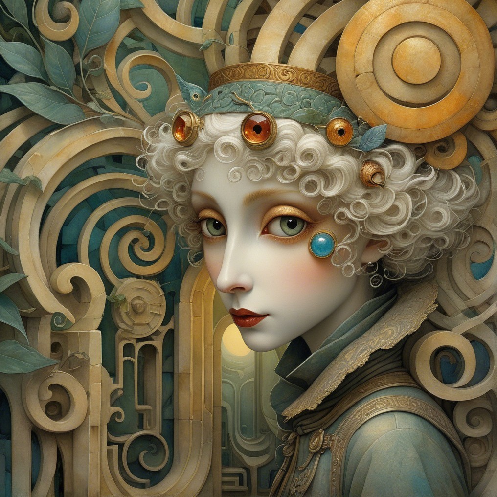Close up, impish mischievous gorgeous white face creature with a staring into a portal in a luscious maze, in the style of Alexander Jansson. by Catrin Welz-Stein, Michael Parkes. By Rob Gonsalves, Markus Pierson. Bronze tones.
