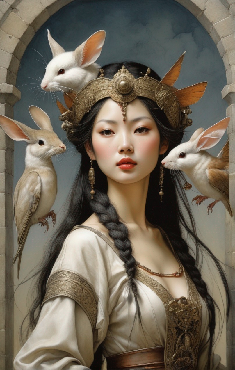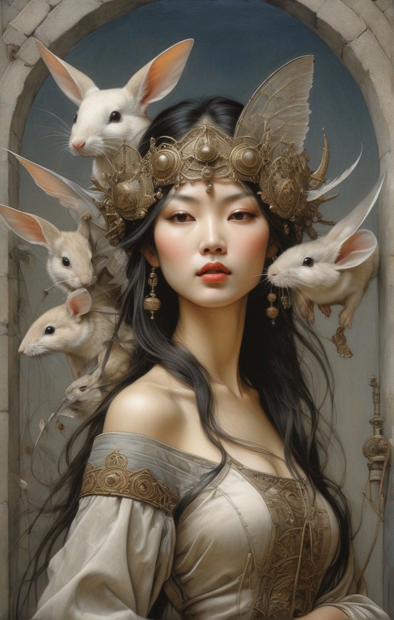 A woman with long black hair and a golden crown adorned with horns and intricate details. She has fair skin and red lips, dressed in a white garment.