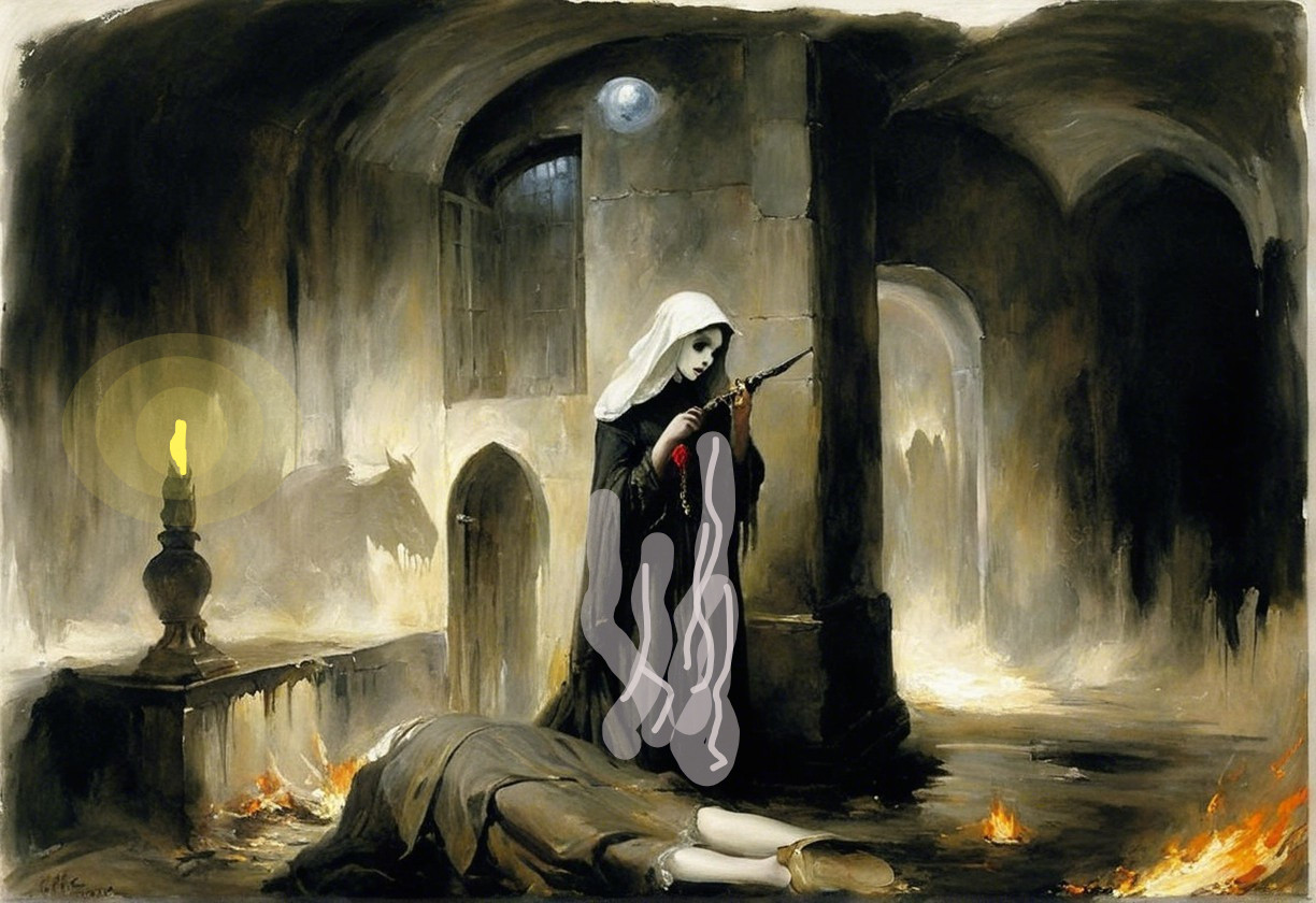 A somber painting of a veiled woman in mourning by candlelight, with paper burning and a ghostly portrait in the background.