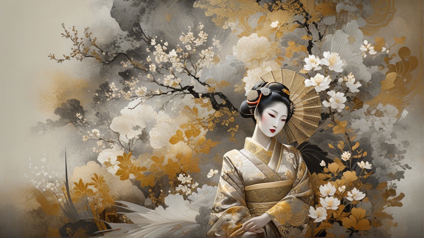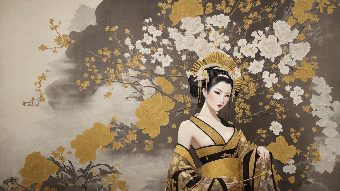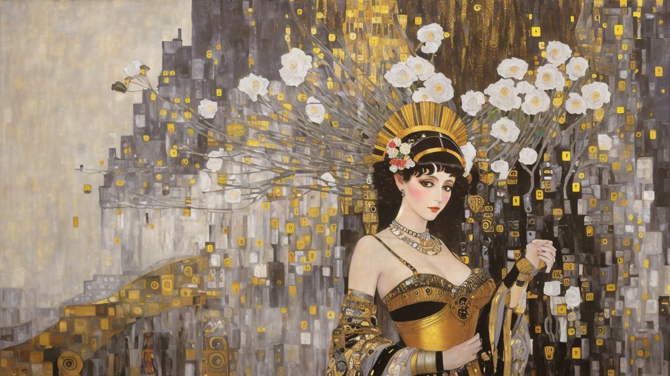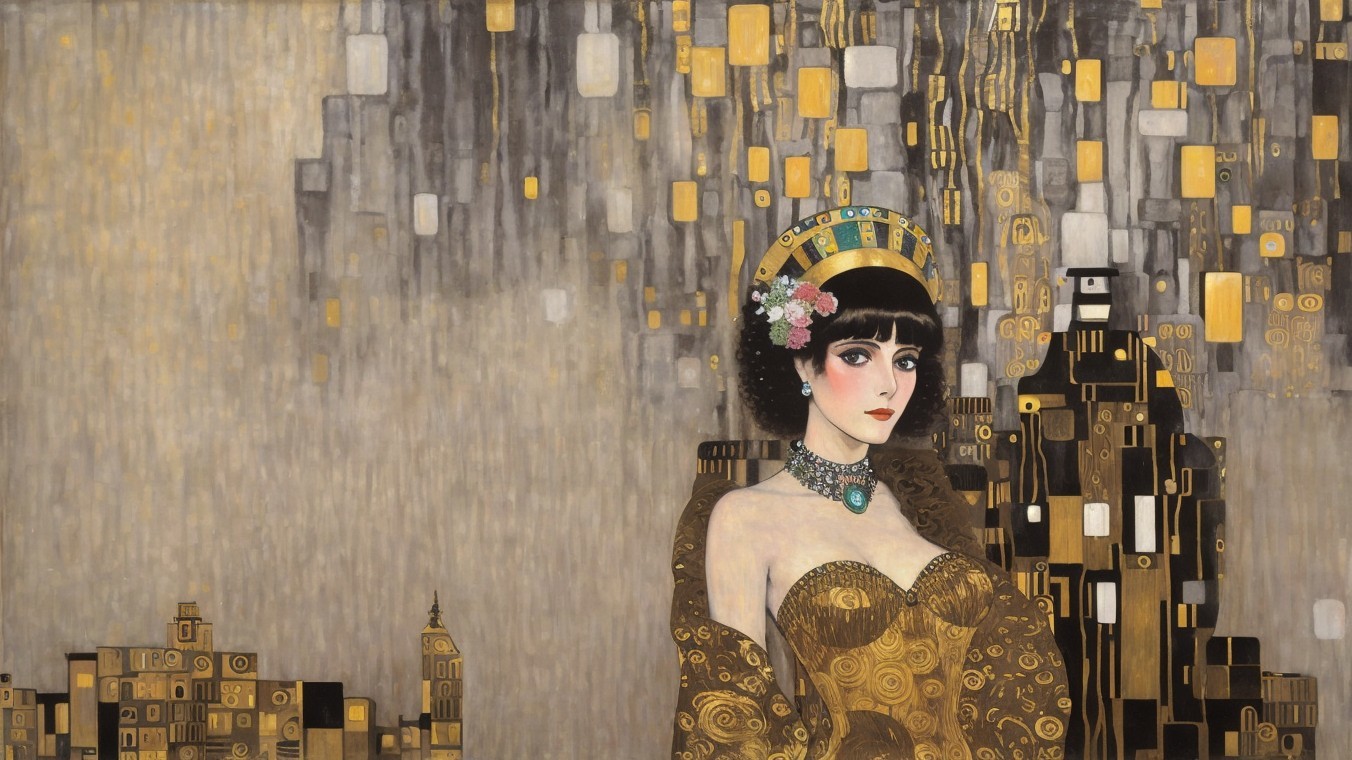 A glamorous woman in vintage attire stands against a backdrop of a bustling cityscape. The art evokes a sense of bygone elegance, with warm lights illuminating the skyline.