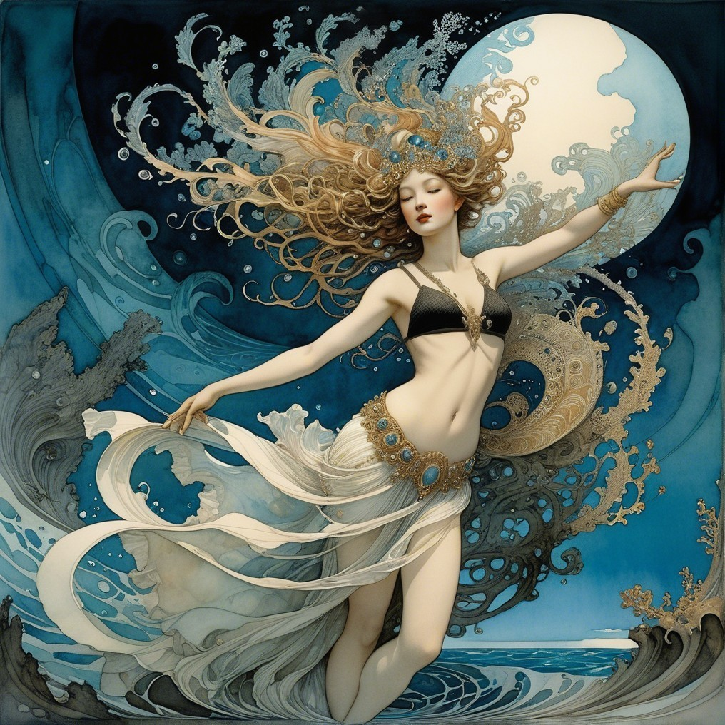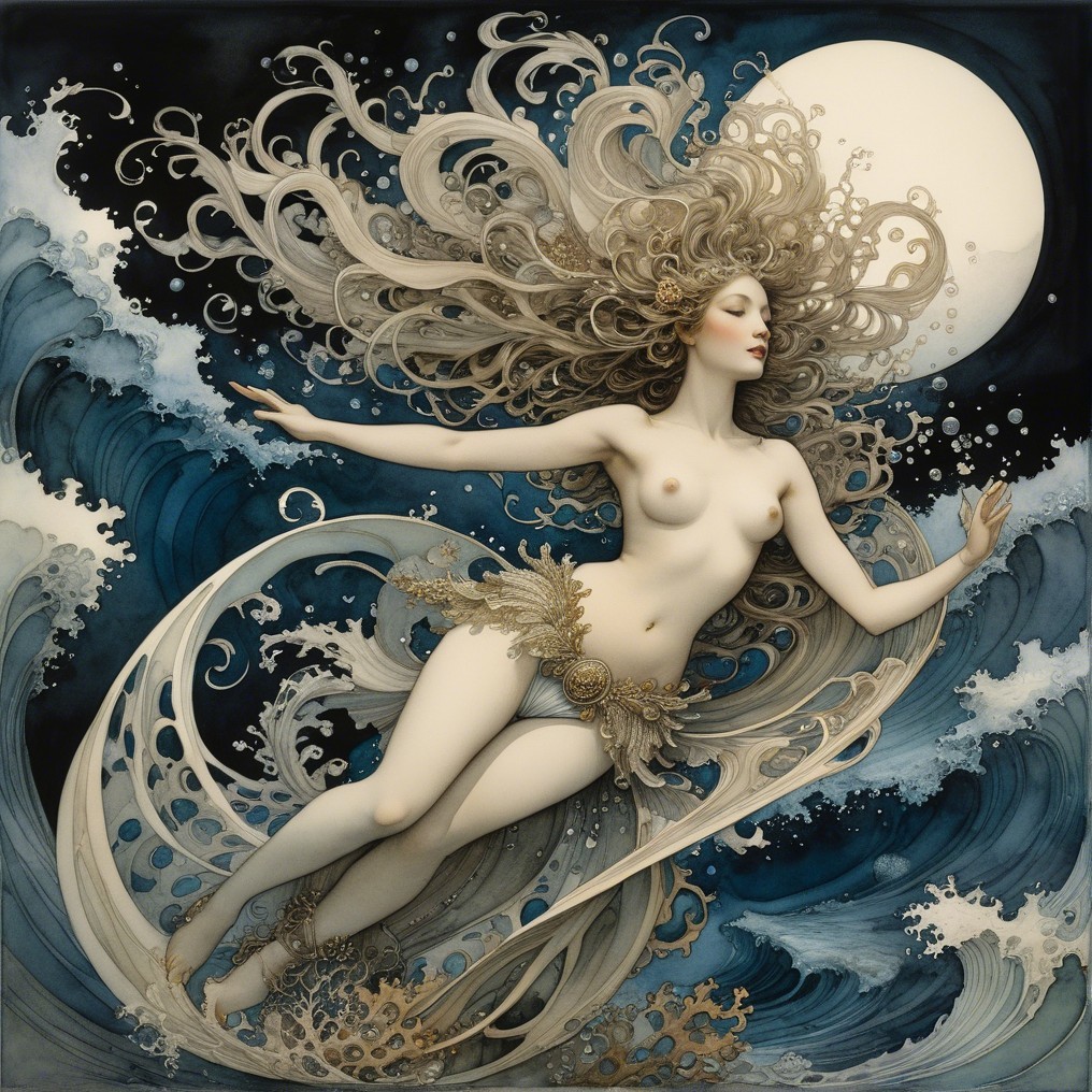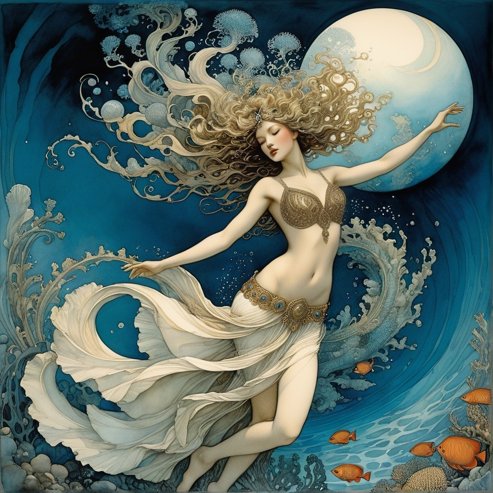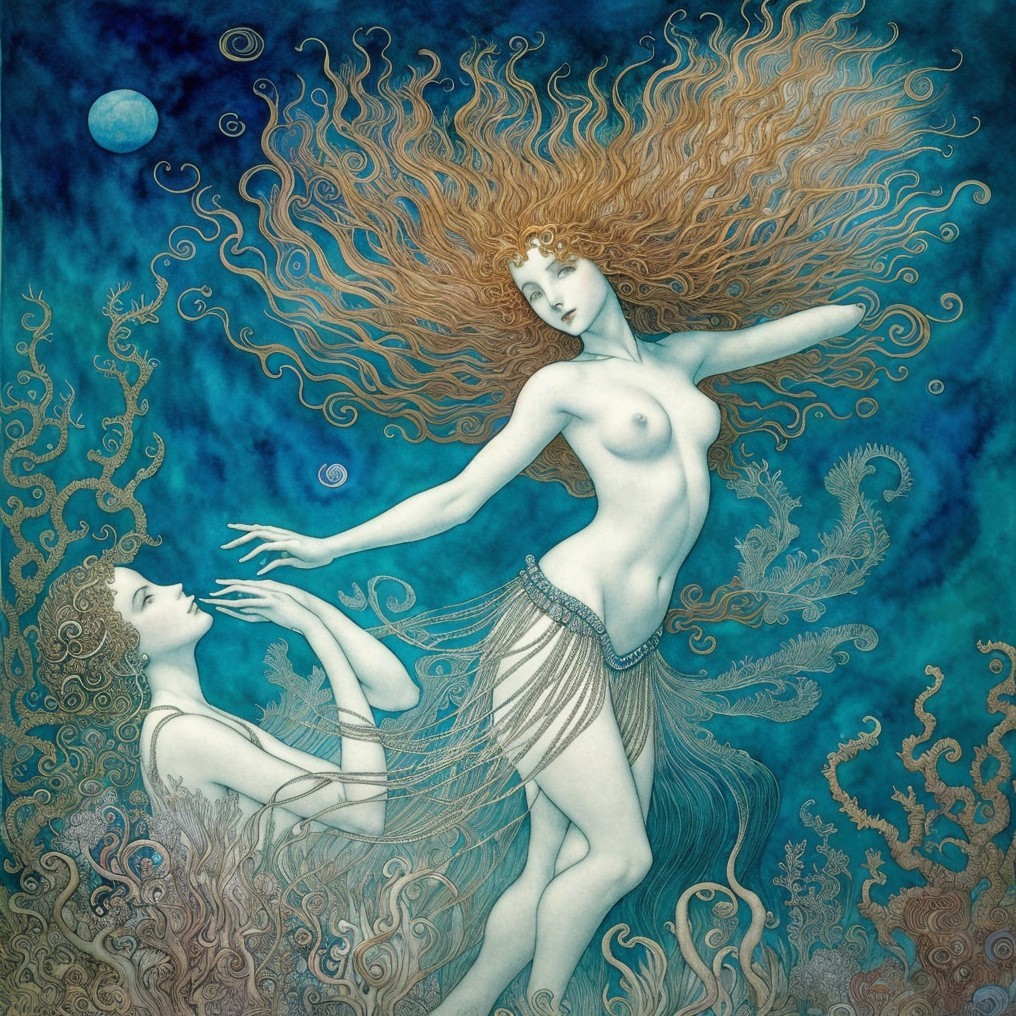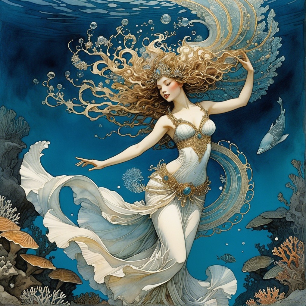A graceful figure adorned in flowing garments swims through vibrant underwater scenery, surrounded by colorful fish and coral, exuding an ethereal, magical ambiance.