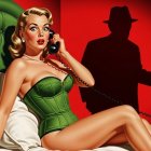 A glamorous woman in a vintage green corset sits on a bed, speaking on the phone. A shadowy figure with a knife looms ominously behind her against a striking red background.