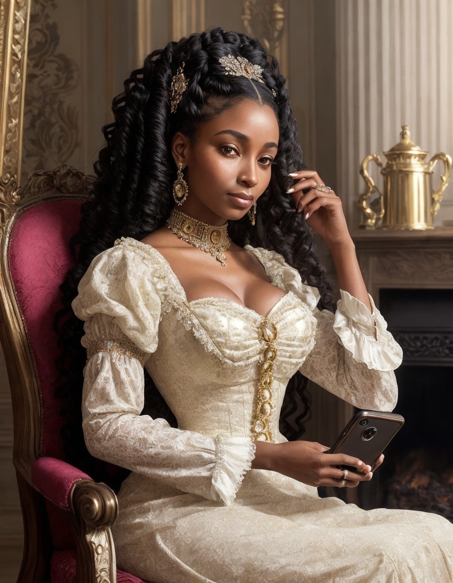 Prompt: Victorian Oil on canvas portrait of a Beautiful Wealthy African American Victorian Queen with tall beehive styled hair, sitting in a beautiful high back chair near a fireplace, holding up a modern smartphone for a selfie. head and shoulders portrait, 8k resolution concept art portrait by Greg Rutkowski, Artgerm, WLOP, Alphonse Mucha dynamic lighting hyperdetailed intricately detailed Splash art trending on Artstation triadic colors Unreal Engine 5 volumetric lighting. Pixar, Disney, concept art, 3d digital art, Maya 3D, ZBrush Central 3D shading, Victorian furniture background, cinematic, Reimagined by industrial light and magic, 4k resolution post processing masterpiece