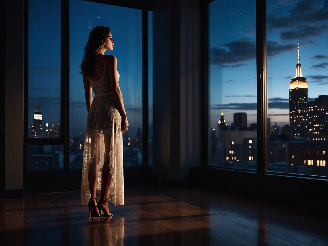 A silhouette of a woman in an elegant dress stands by a window, overlooking a city skyline at dusk. The Empire State Building glows in the distance, casting a romantic atmosphere.