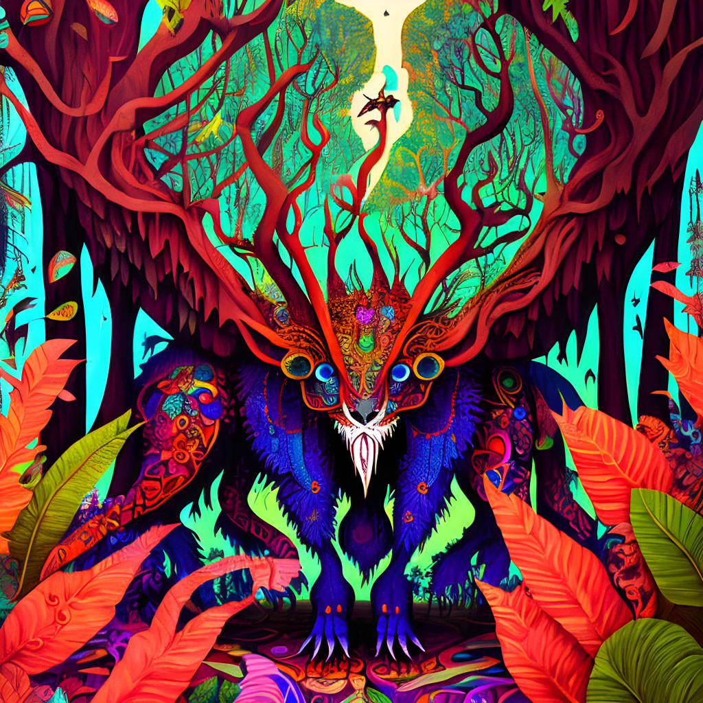 Colorful Psychedelic Forest Scene with Central Tree Creature in Neon Hues