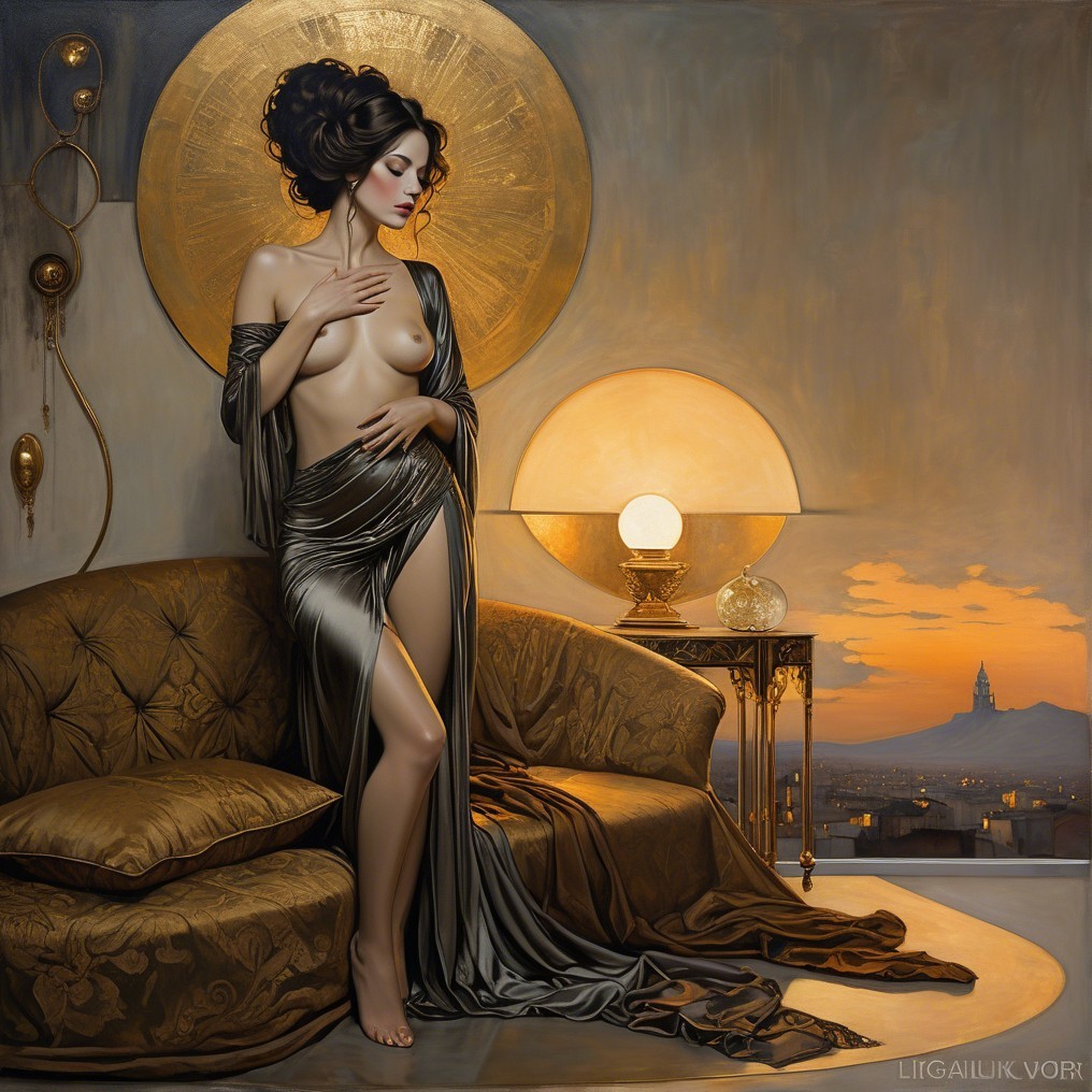 A woman in an elegant black outfit sits gracefully on a table, surrounded by warm lighting and a cozy interior. Her attire blends sophistication with allure, creating a captivating scene.
