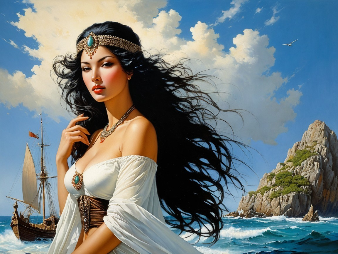 A stunning woman with flowing black hair stands against a dramatic sky, adorned in elegant jewelry. A sailing ship and rocky island complete the picturesque, adventurous scene.