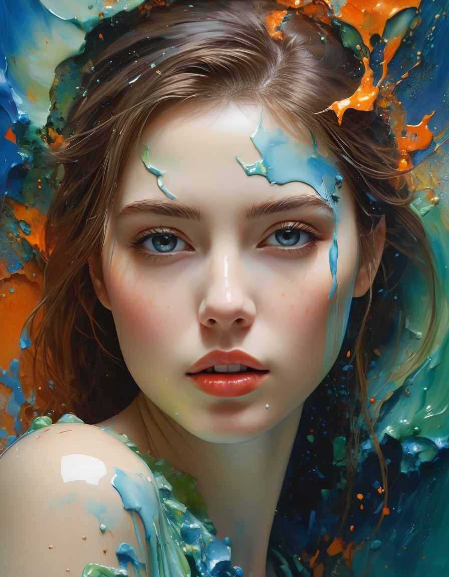 Portrait young woman shimmering with splatter paint, splashes of water and paint drain, skin tone echoing the light porcelain hue