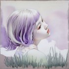 A serene portrait of a woman submerged in water, with flowing silver hair and striking red accents. Bubbles and seaweed create a dreamy, ethereal atmosphere, blending beauty and nature.