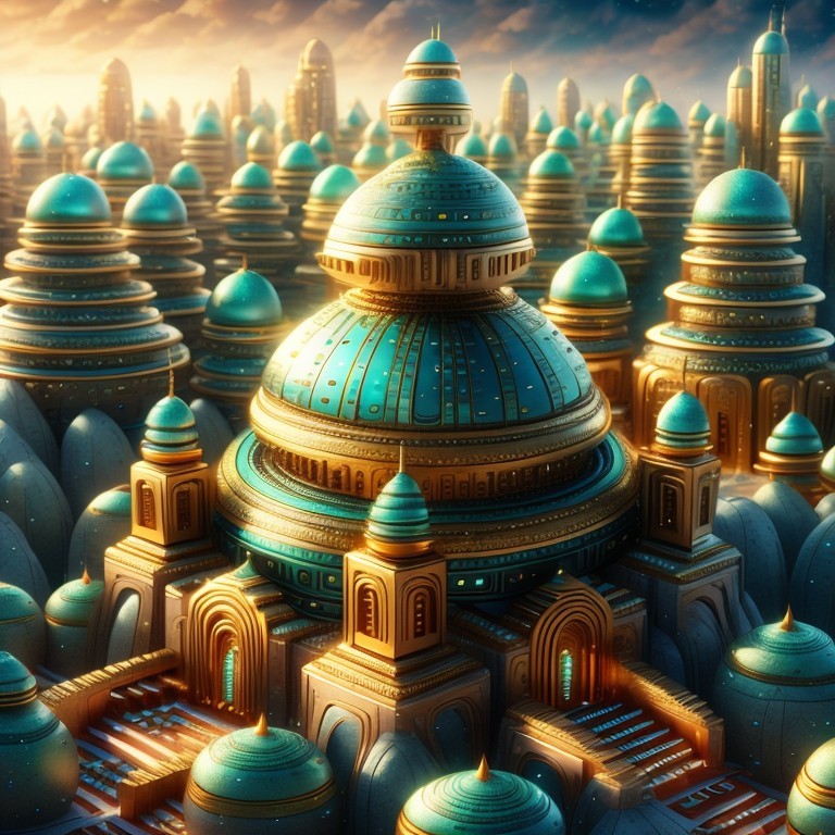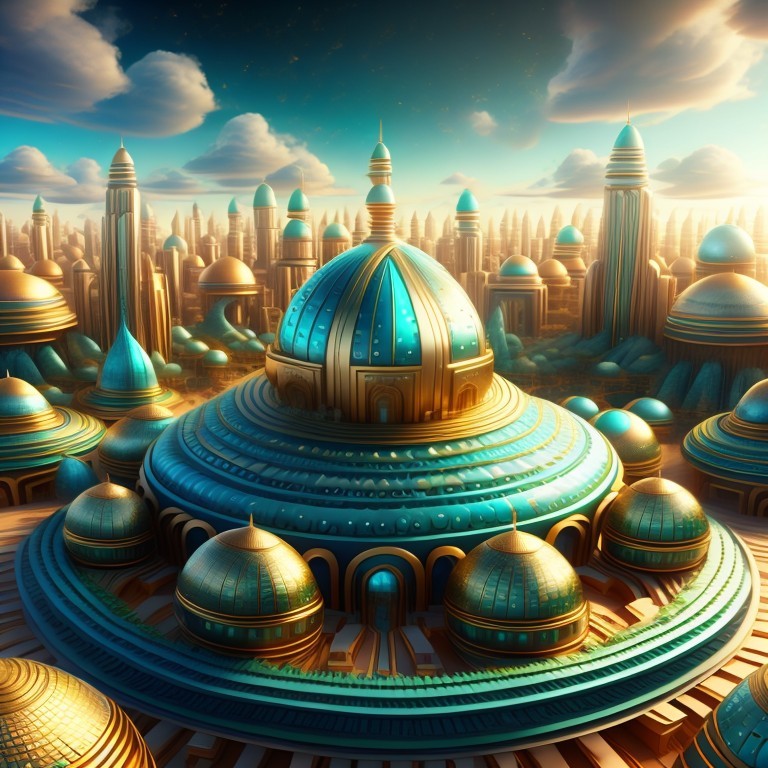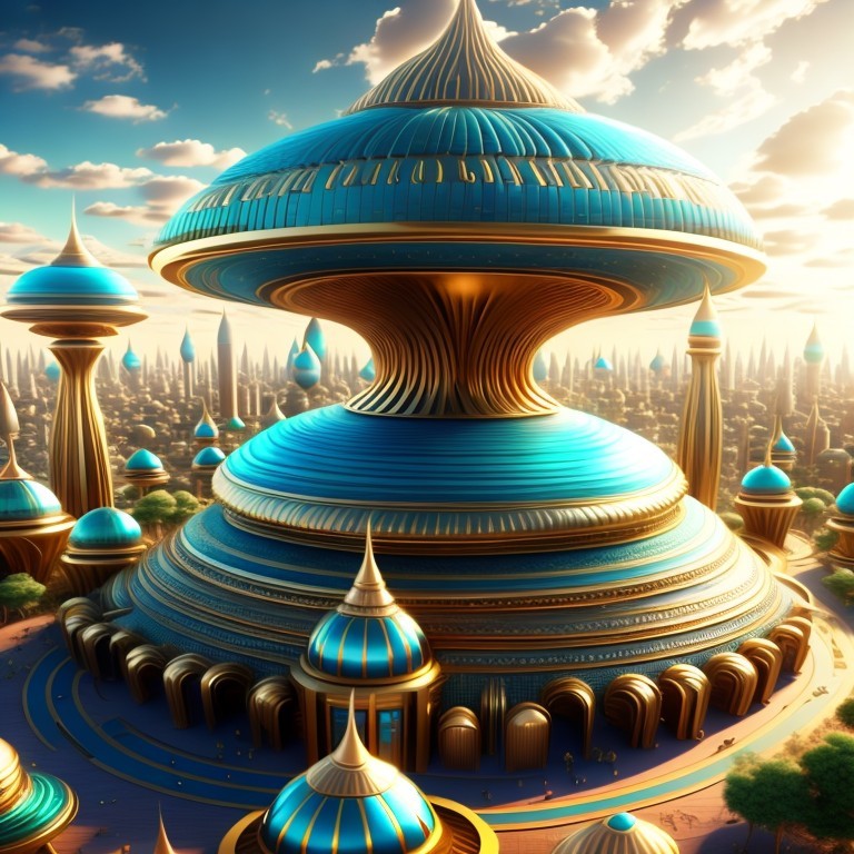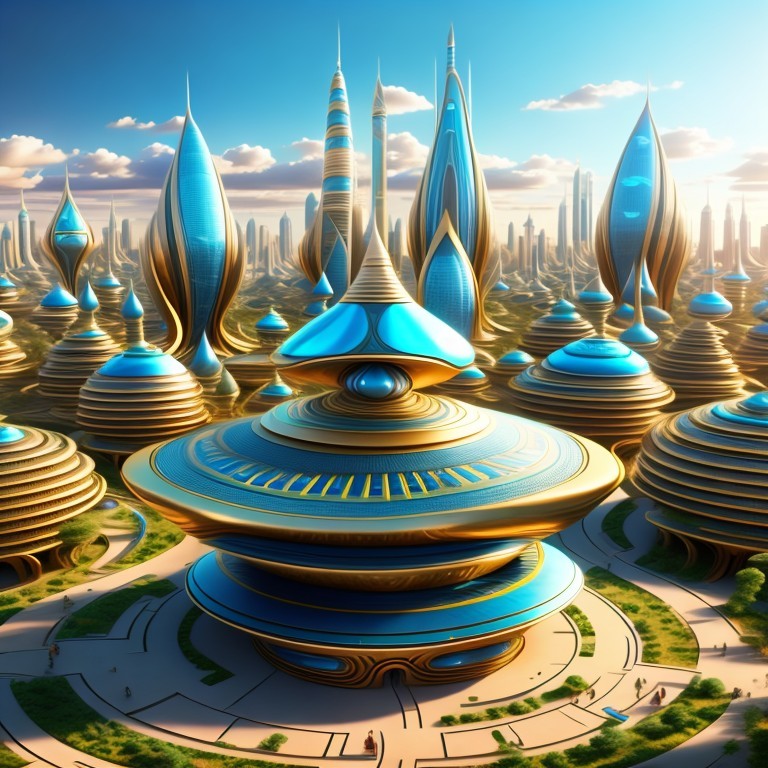A vibrant, futuristic cityscape with sleek, golden structures and blue glass under a bright sky.