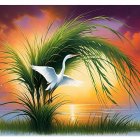 A white heron spreads its wings gracefully above lush green plants, silhouetted against a vibrant sunset over calm waters, creating a serene and picturesque scene.
