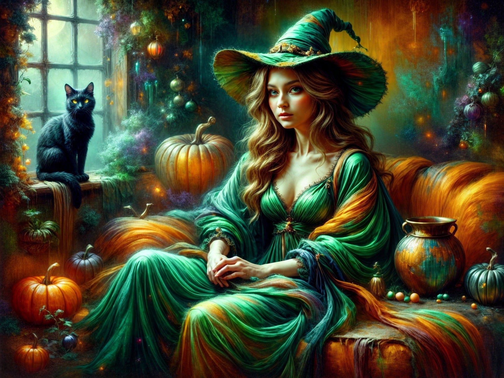 A mystical scene featuring a woman in a flowing green dress and pointed hat, seated near a window. Accompanied by a black cat, the room is adorned with glowing lanterns and magical decor.