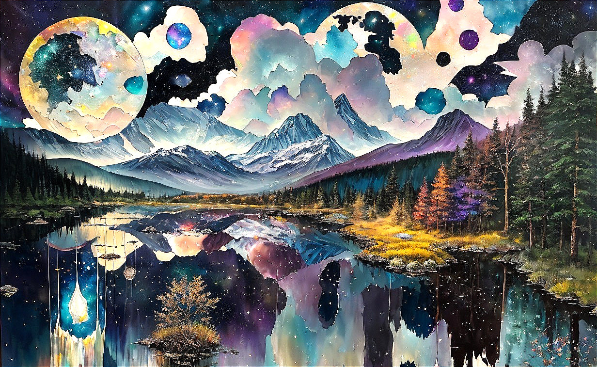 A vibrant painting depicting mountains reflected in water with a cosmic sky filled with moons and nebulae blending with the clouds.