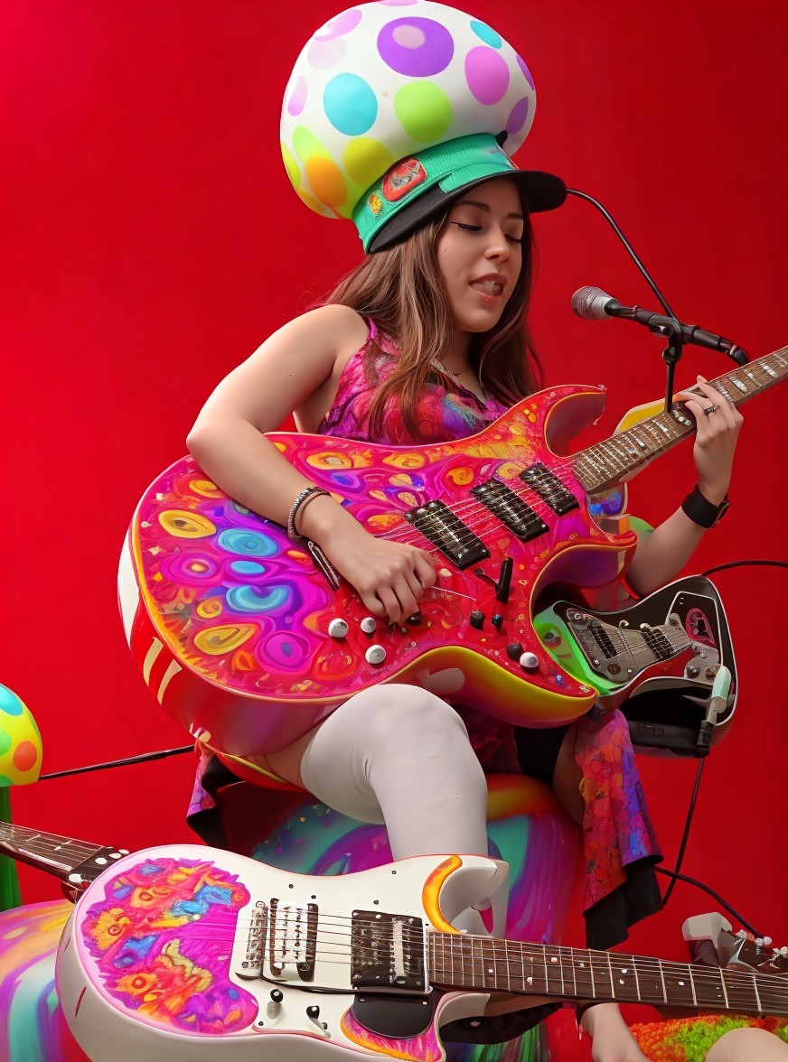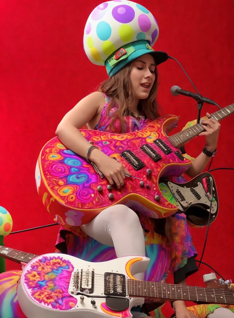 Musician in Vibrant Costume Plays Colorful Guitar Instrument