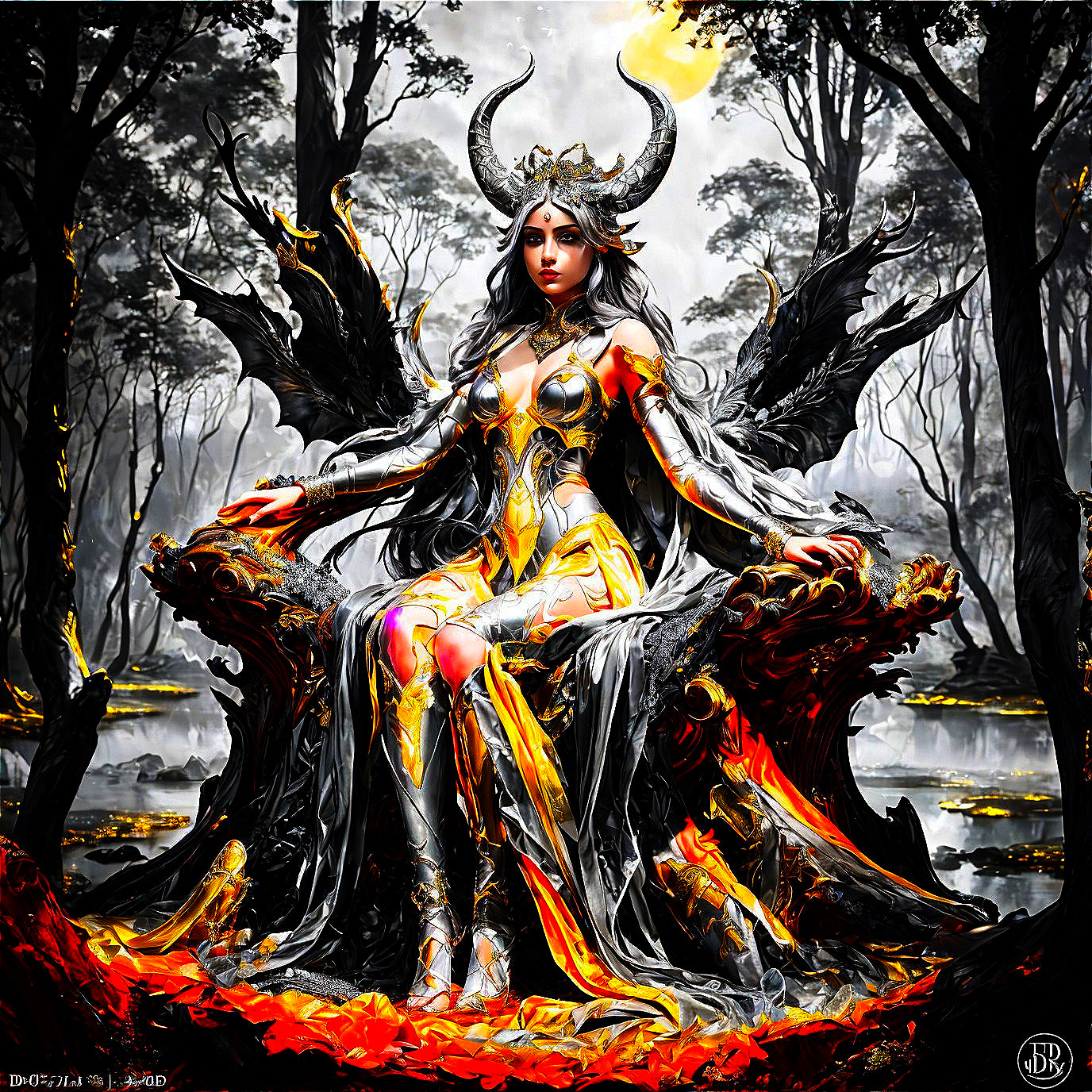 A mystical winged queen with horns sits on a throne in an eerie forest, adorned in golden armor, exuding a powerful and enigmatic aura.