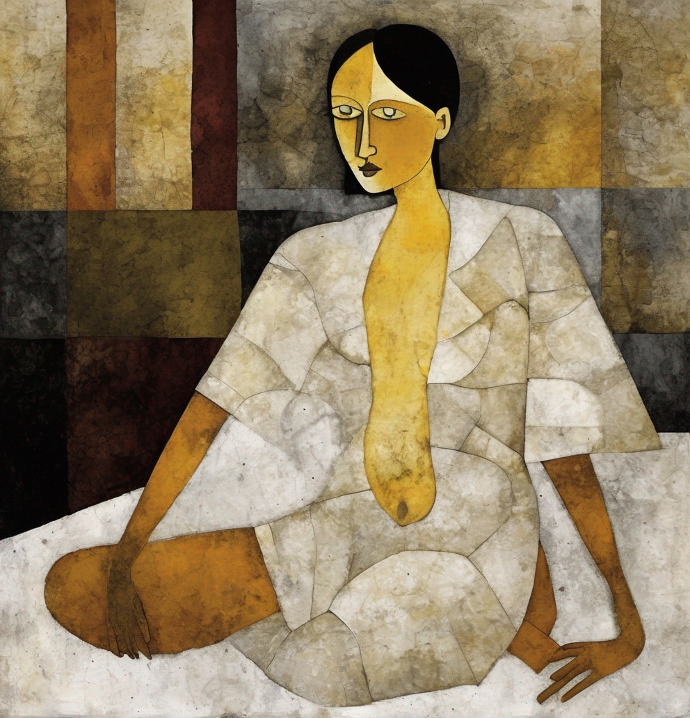 Cubist-style portrait of a woman with prominent eyes and red lips against an abstract, earth-toned background.