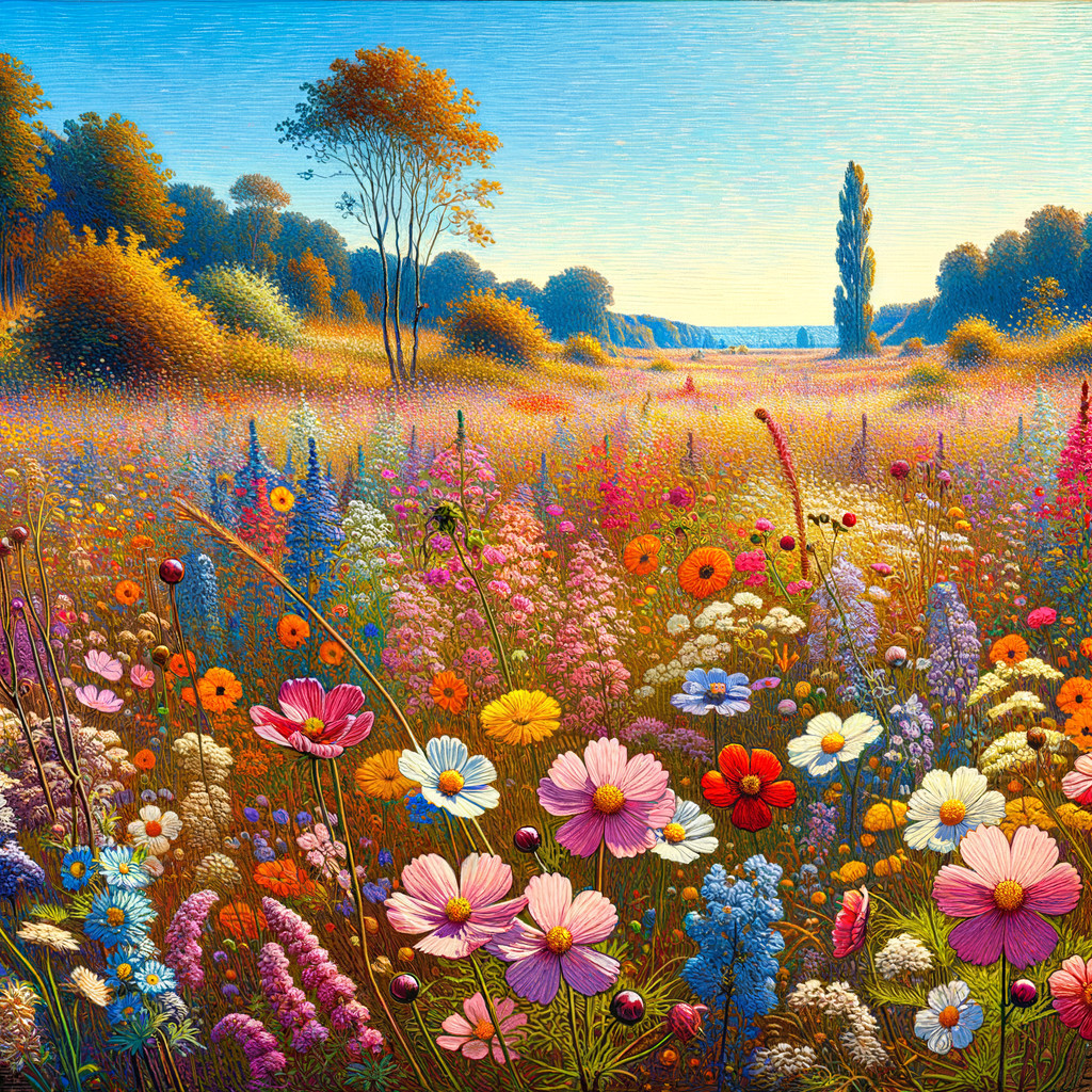 Vibrant, impressionist-style painting of a colorful flower field under a blue sky with fluffy clouds.