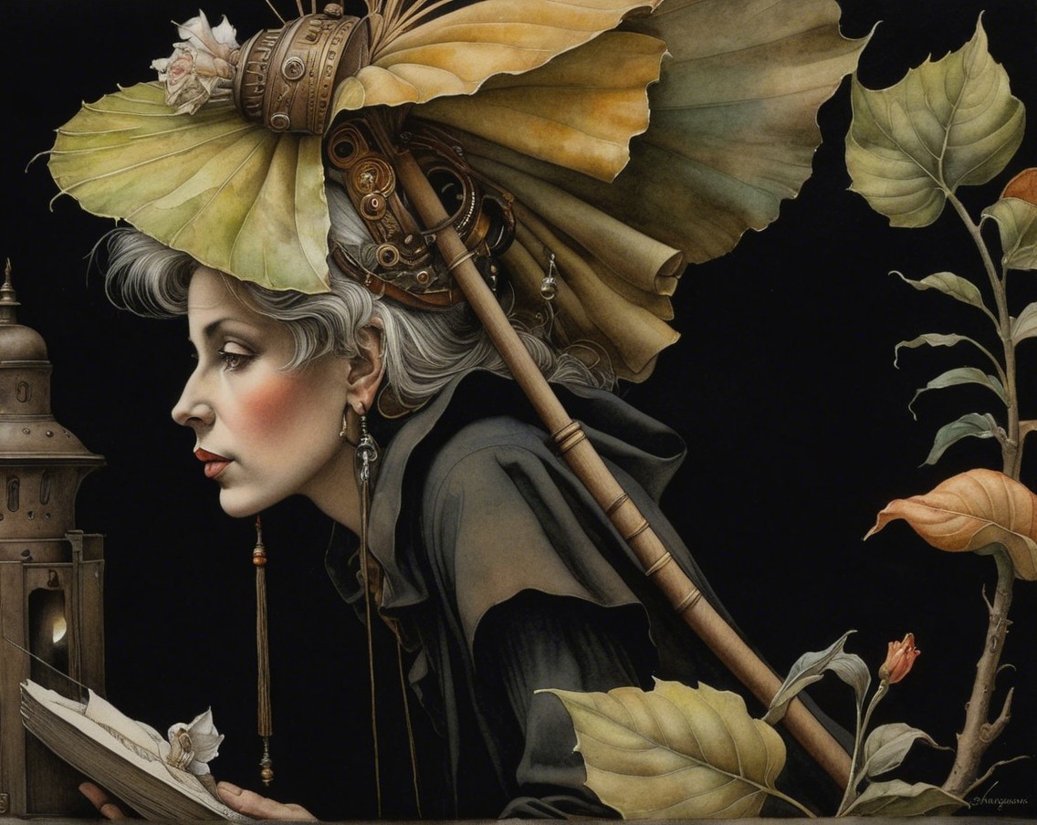 Witch doctor. , colored ink drawing, watercolor artwork on old withered paper, vintage, by Caravaggio, Fragonard, Anton Pieck, pale colors, high detail, intricately detailed, hyperdetailed volumetric lighting, art nouveau graphic steampunk ., whimsical, beautiful, poignant, touching. colors blush bronze, black. soft watercolor extra water in magical realism by Annigoni, Egon Schiele, Milo Manara, Botticelli, Catrin Welz-Stein, Jean Metzinger, Klimt, perfect eyes, perfect handsface, highly detailed, complementary colors, hyper detailed. Watercolor and ink splatter, dynamic pose, dark blue background, unreal engine, alphonse mucha, global illumination, detailed and intricate environment Beautiful woman in the style of Pino Daeni Dorota Piotrowiak Edward Gorey, junji ito, klimnt , gold leaf color, silver leaf color beautiful dynamic lighting high definition hdr * Random prompt award winning Max Ernst ultra detailed 4K 3D Texture