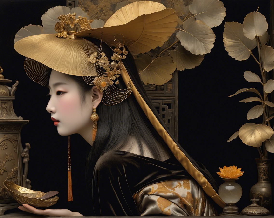 The girl in her boudoir, 3rd century Chinese miniature art, Velvet blush bronze, Shabby, Dull Gold, Amber Gray, marbled. dramatic