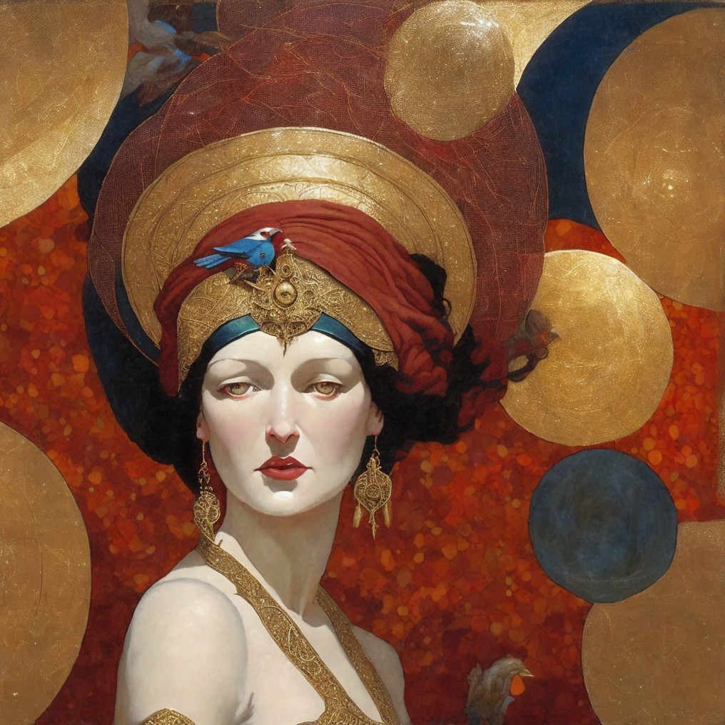 A striking portrait of a woman adorned in golden jewelry and a flowing red cape, with a black bird perched nearby, set against a dramatic sky lit by a warm, glowing sun.