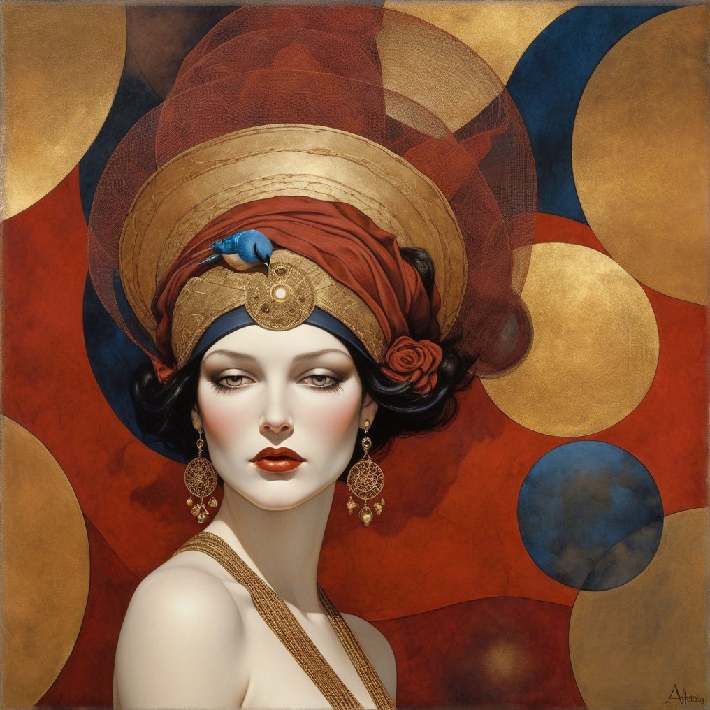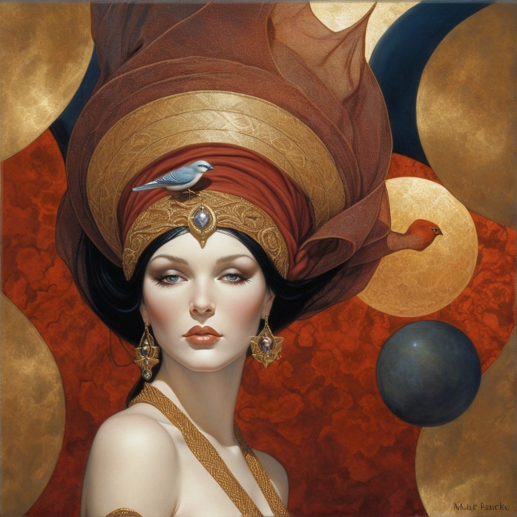 + Prompt:Charms, spells, enchantress, magic. Faith is the essential ingredient. If one loses faith in a magic, one has lost everything. I haven't lived life, I haven't lived love. Just bird's eye view from the sky above". Love is a fragile thread, woven through moments. This artwork amalgamates the artistic styles of Michael Parkes,