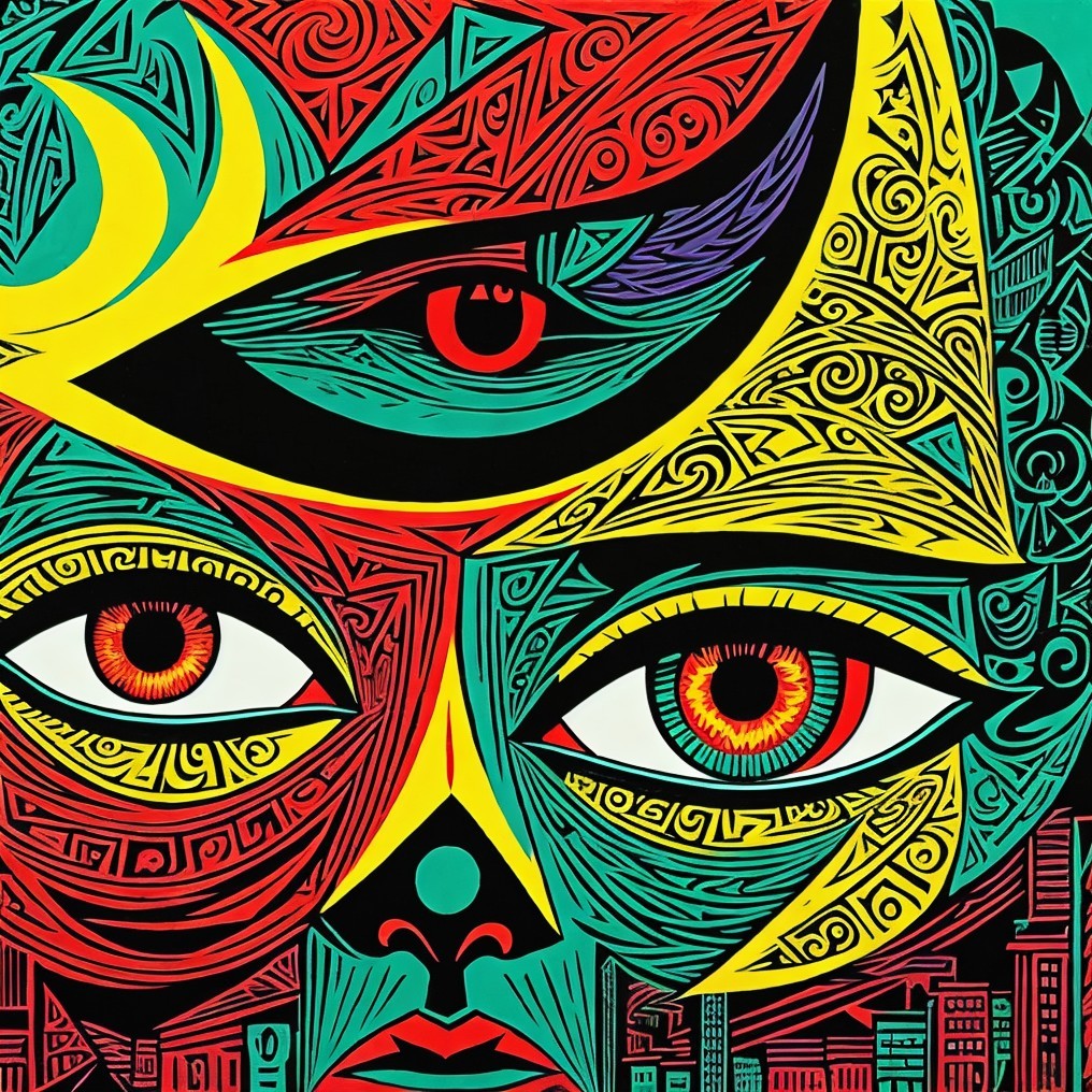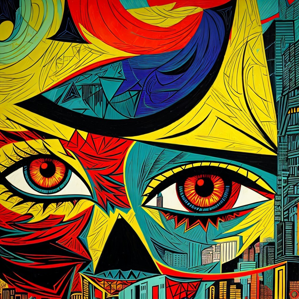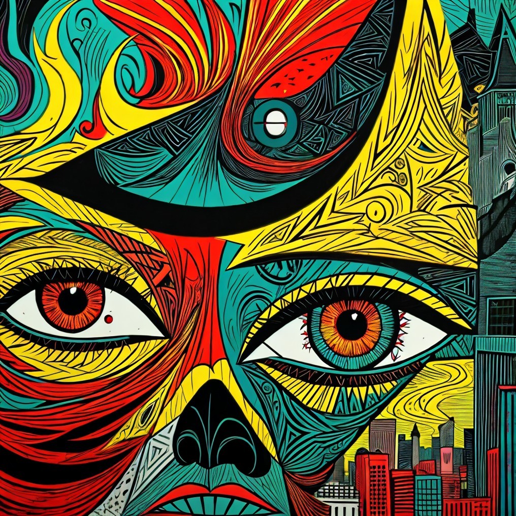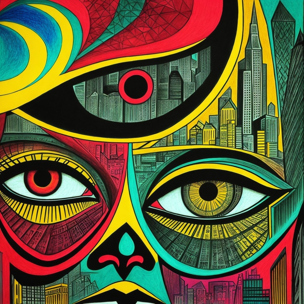 Artistic Statement: This work fuses brut art’s raw contour, postimpressionist color ritual, and cubist anatomy with symbolic surrealism. The metropolis becomes a subconscious construct, where pop clarity and psychedelic nuance reflect emotional complexity. The city stares back.
