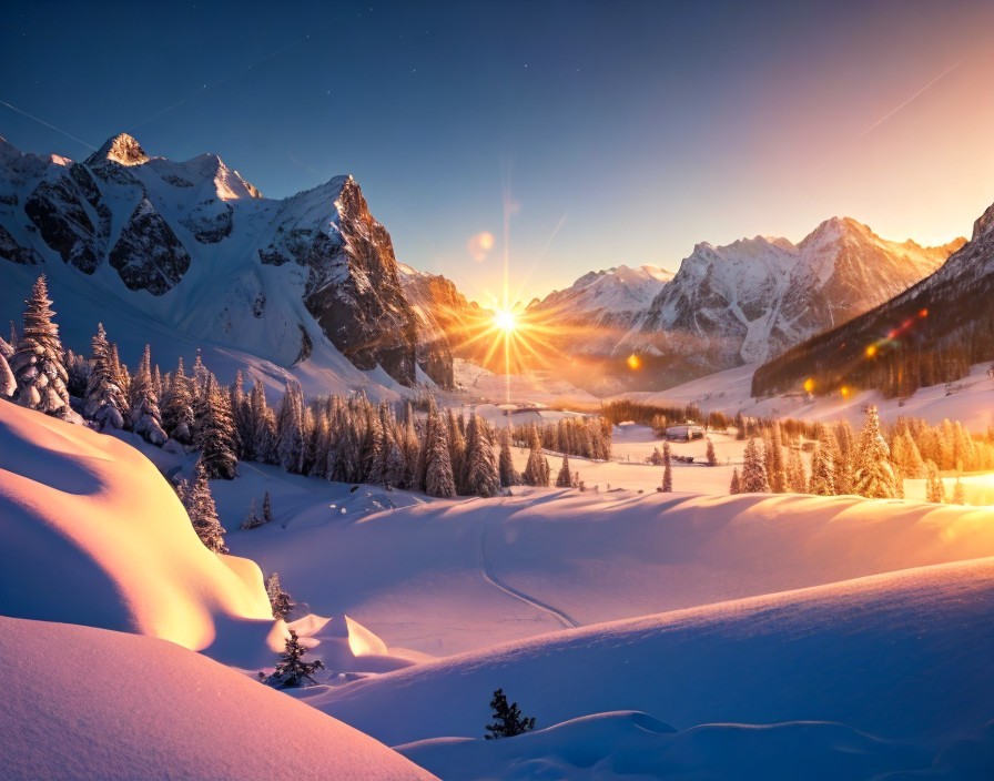 Red figure gazes at snow valley under sunrise with crescent moon.