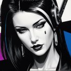 A stylized portrait of a young woman with vibrant blue hair and striking golden eyes. She wears colorful headphones, surrounded by abstract patterns and bright splashes of color, exuding a modern vibe.