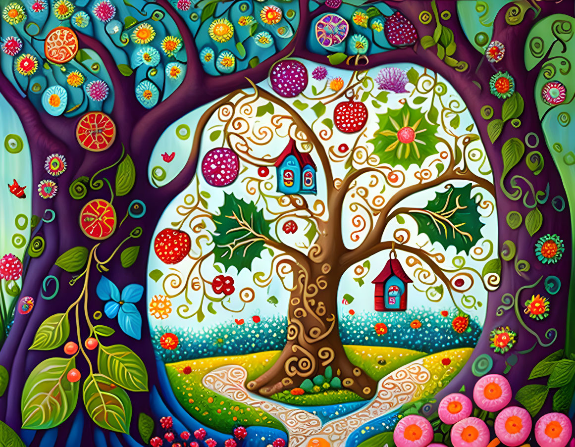 Colorful Tree Painting with Birdhouses and Floral Landscape