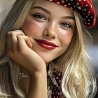 A young woman with wavy blonde hair and striking blue eyes smiles warmly. She's wearing a red beret adorned with white polka dots and holding a colorful cup, exuding a cheerful vibe.