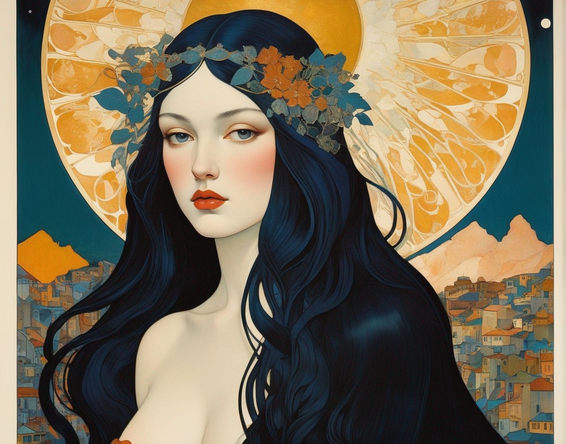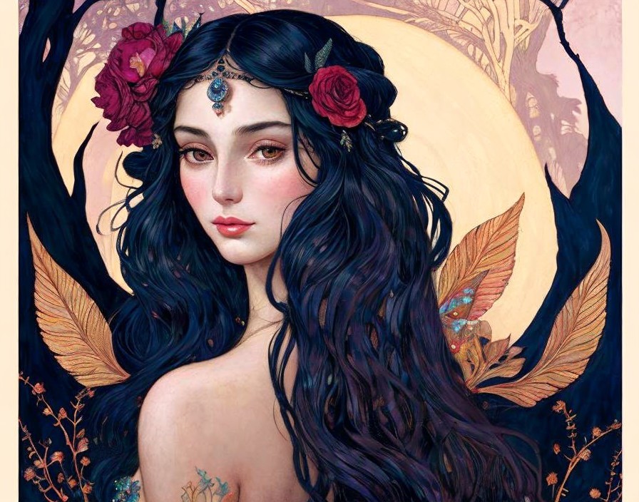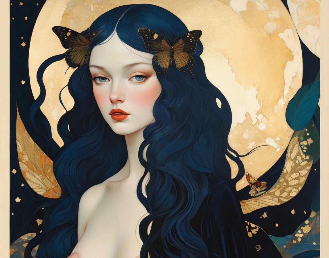 A painting of a woman with butterfly wings behind her, styled in Renaissance clothing against a sky backdrop with floating lanterns.