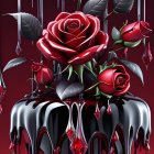 A glossy, dark chocolate-inspired container with vibrant red accents sits atop a reflective surface. Droplets of liquid glisten, enhancing its rich, indulgent appearance.