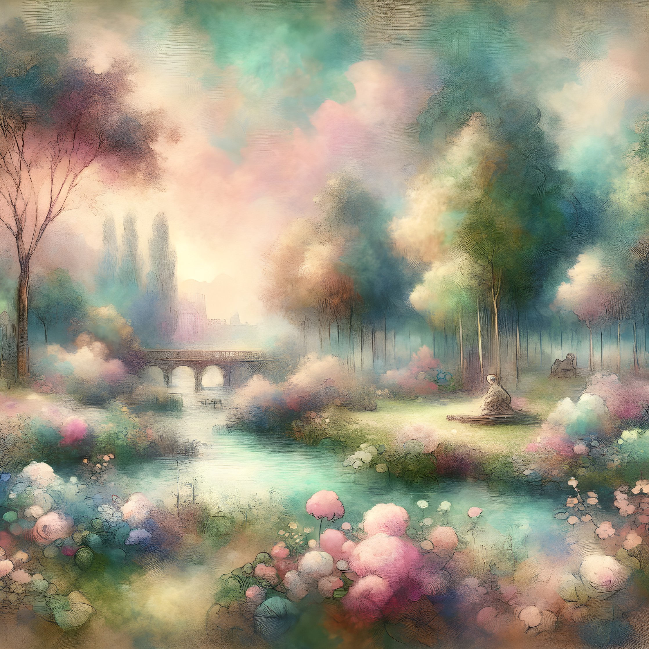 A whimsical, colorful painting depicting a serene, dreamlike garden with lush trees, vibrant flowers, and a tranquil river under a soft, pastel sky.