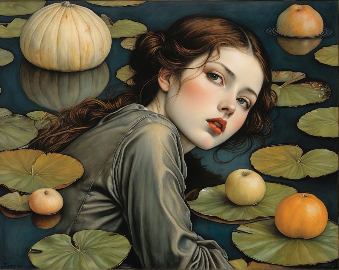 A serene scene featuring a woman in a blue dress, gently cradling a sleeping child. They're framed by a dark background with a full moon and a distant castle, evoking a sense of calm and mystery.