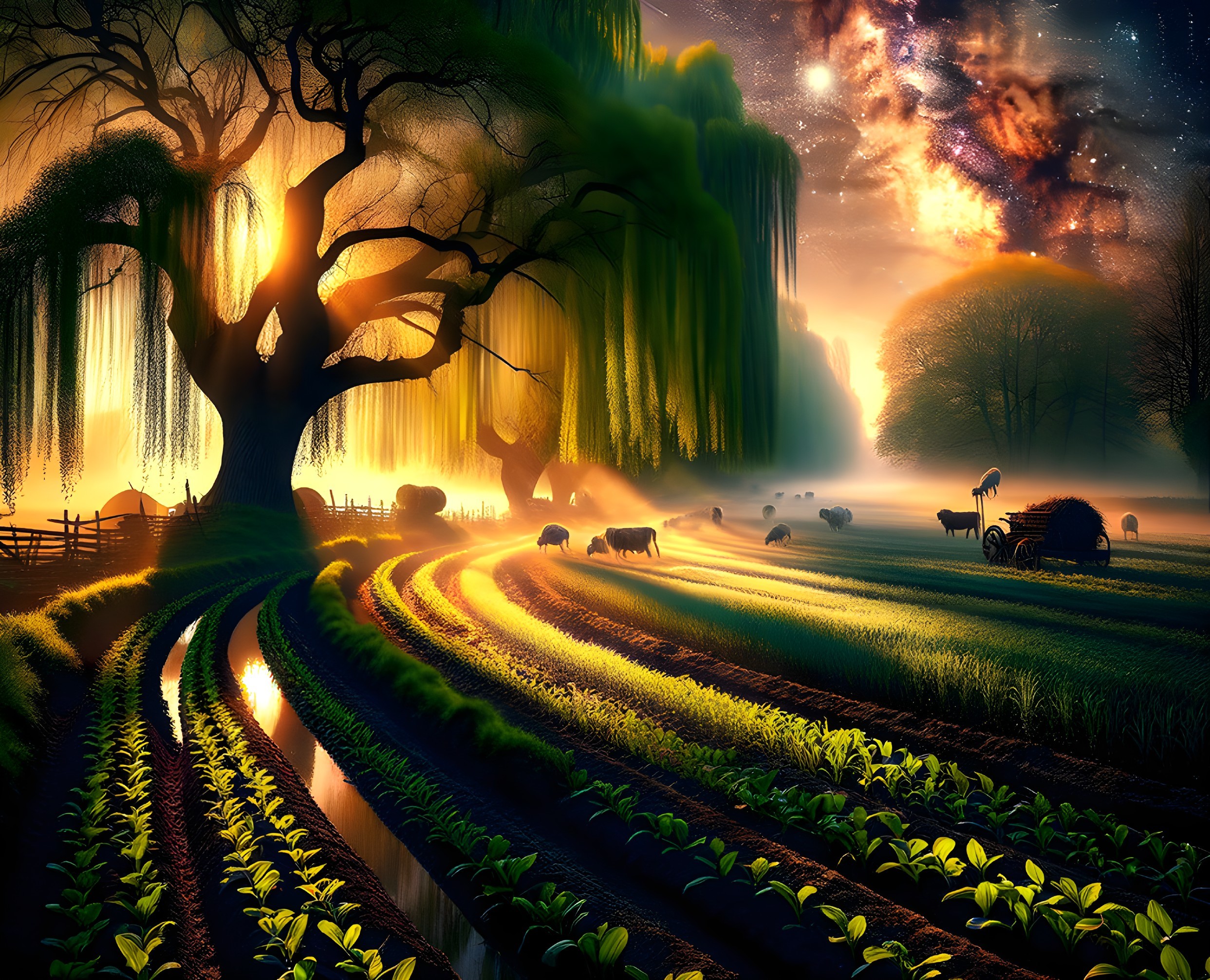 Vivid imagery of nature's beauty unfolds with seedlings in morning light, a grand sycamore tree's shadow, swirling cooking smoke, nostalgic willows, ancient ploughing, sunset hues guiding animals home, and a cosmic galaxy representing profound friendship.