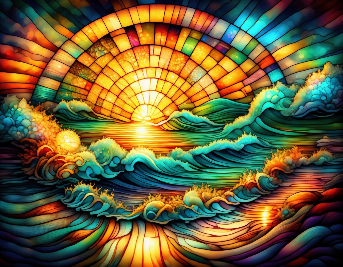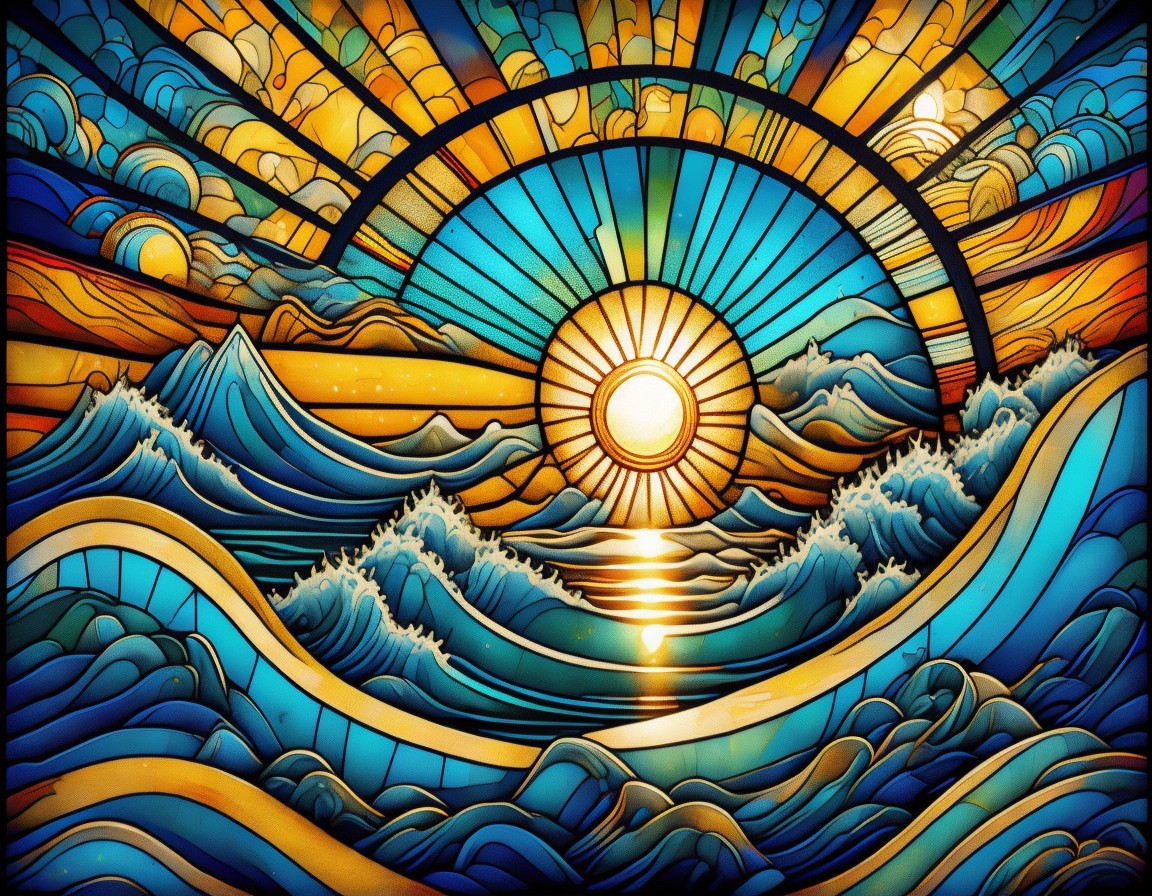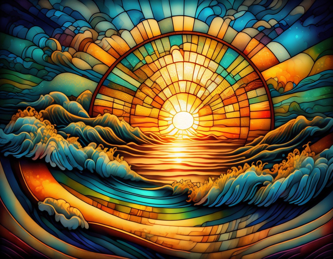Vibrant Stained Glass Sunset Over Mosaic Ocean