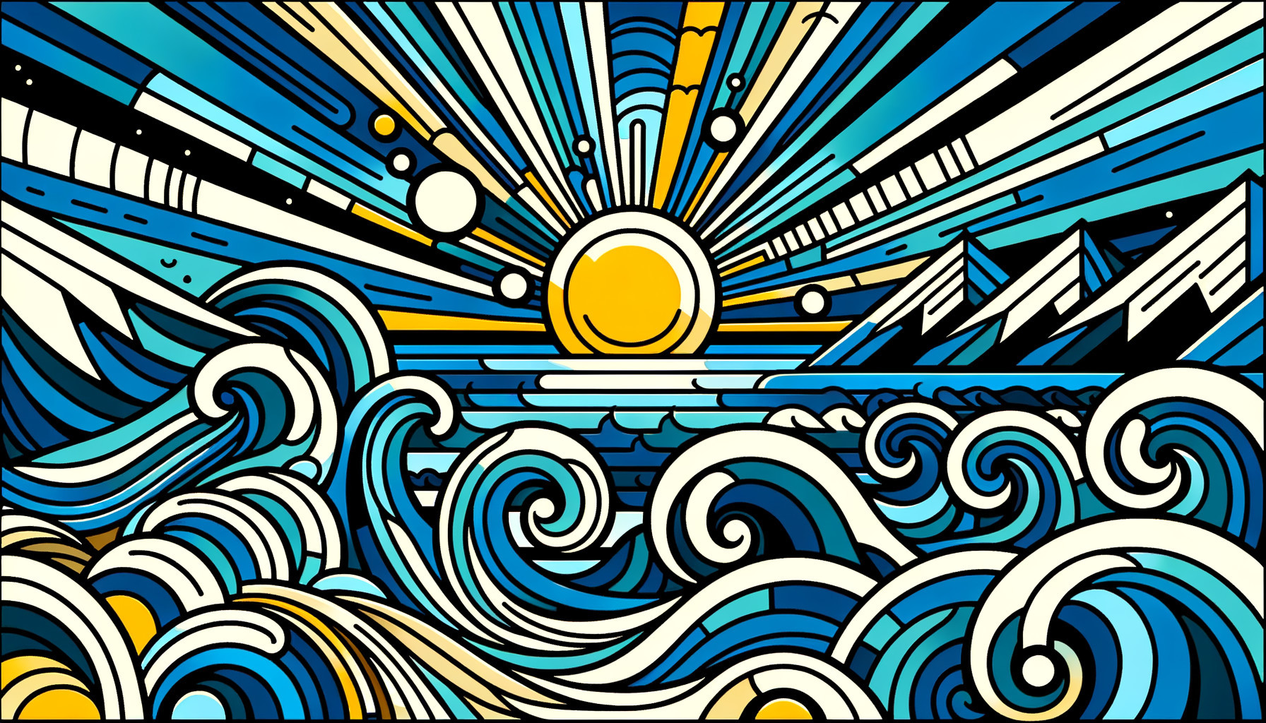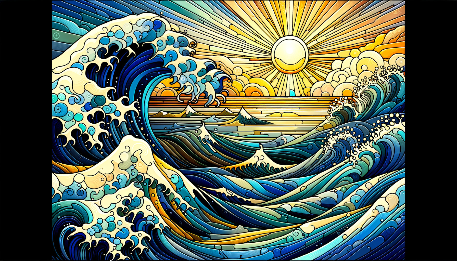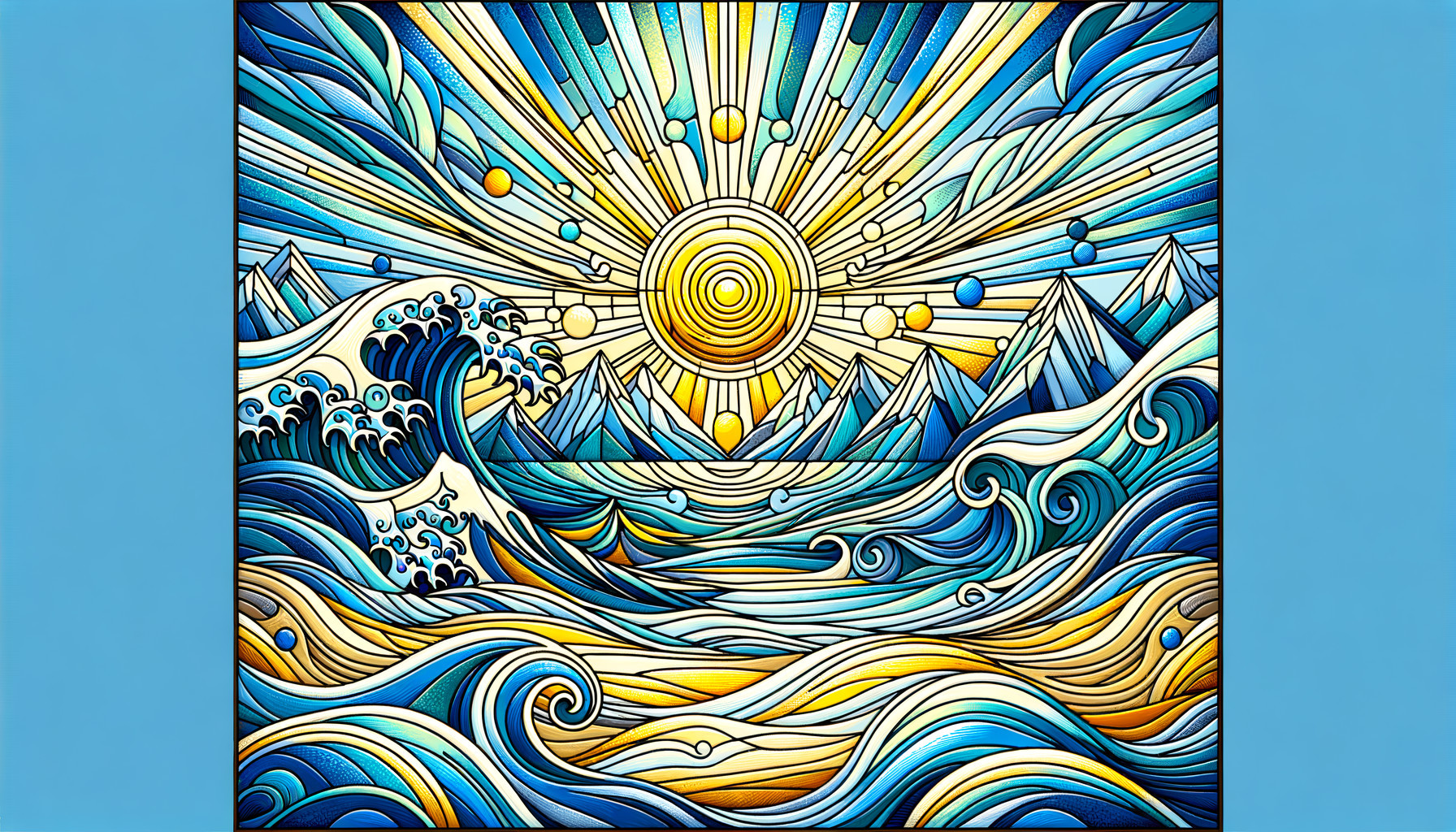 Vibrant Stained Glass Sunset Over Mosaic Ocean