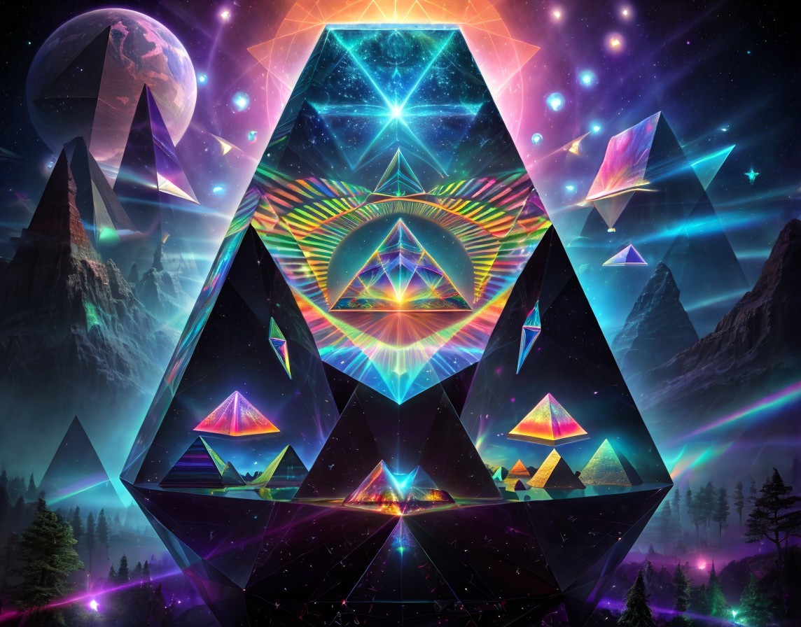 A vibrant cosmic illustration with a hooded figure, featuring an all-seeing eye, pyramids, space, and a neon color palette.