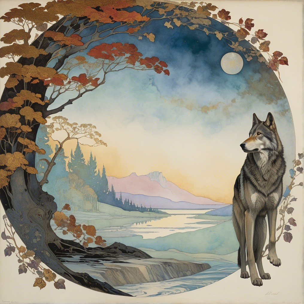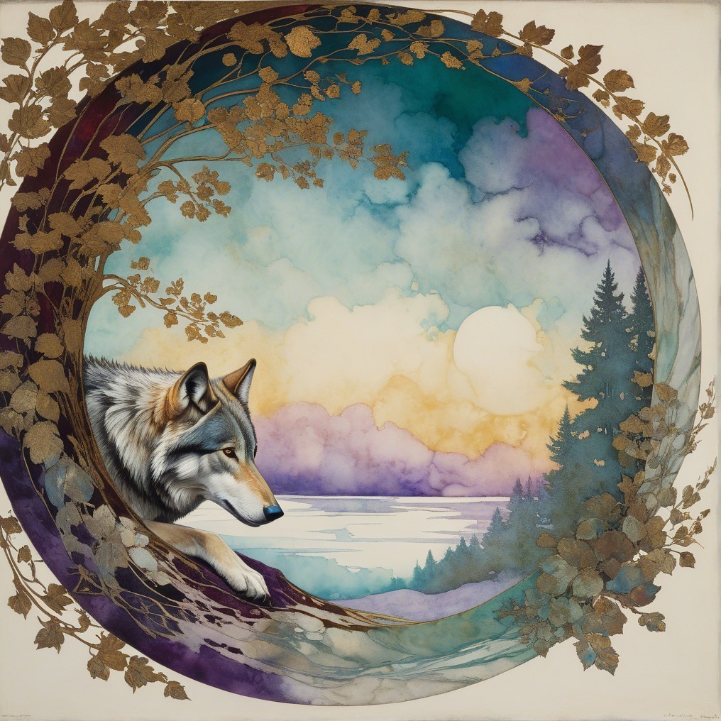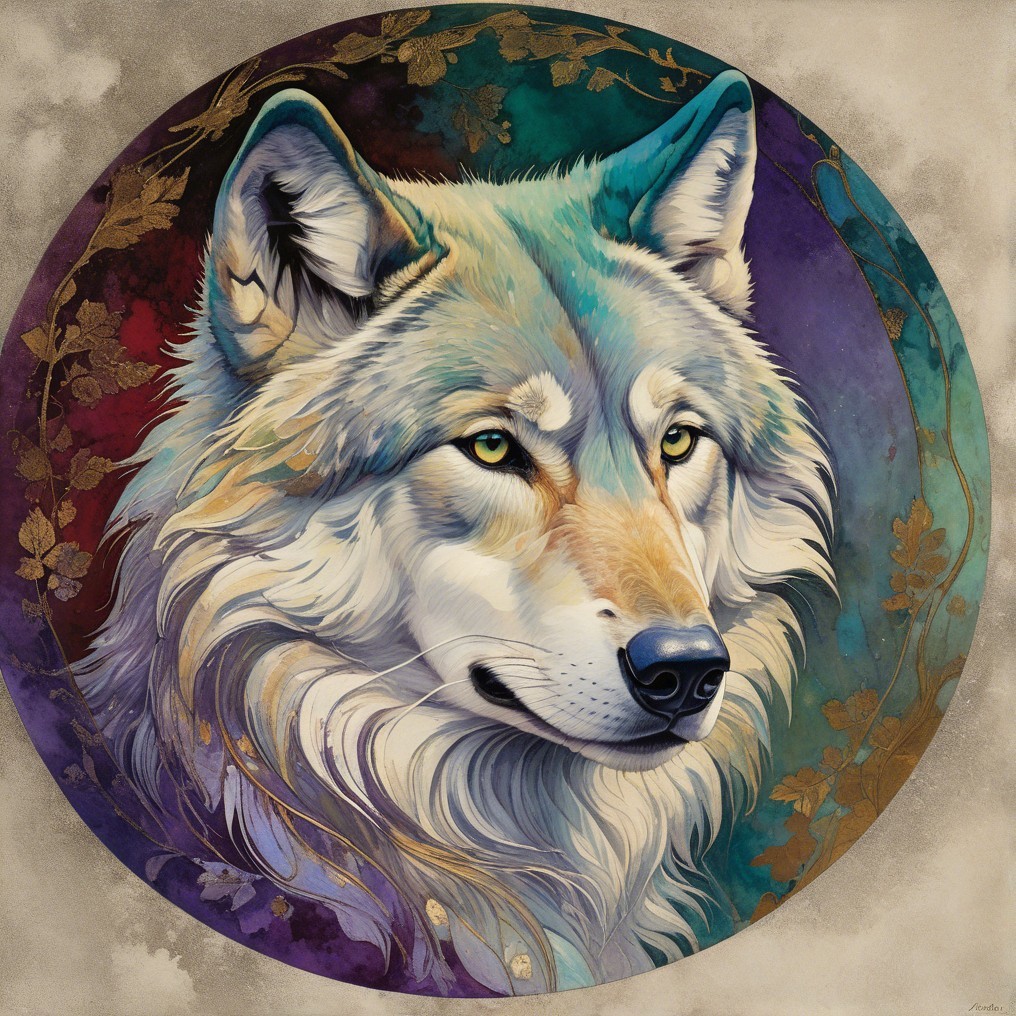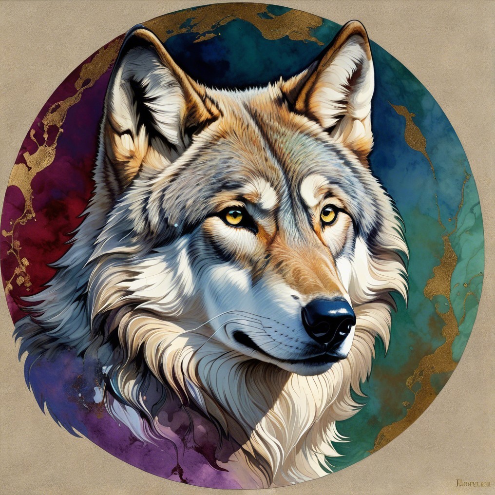 The image features a beautifully detailed, majestic wolf with striking golden eyes. Its fur is a mix of browns and whites, set against a vibrant, swirling background of blues and purples.