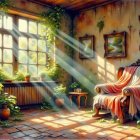 A cozy, sunlit room features a vintage leather chair, a rocking chair, and potted plants. Soft light streams through a window, illuminating the rustic decor and wooden floor.