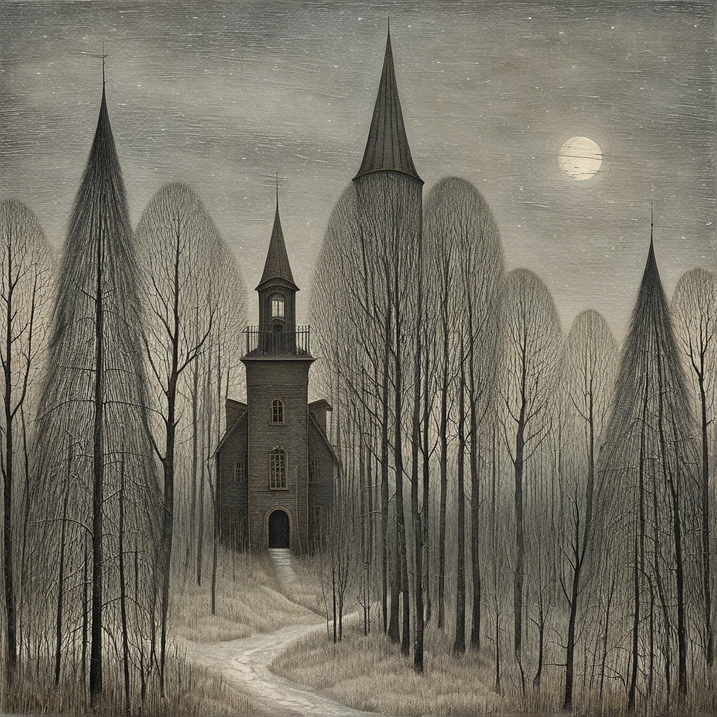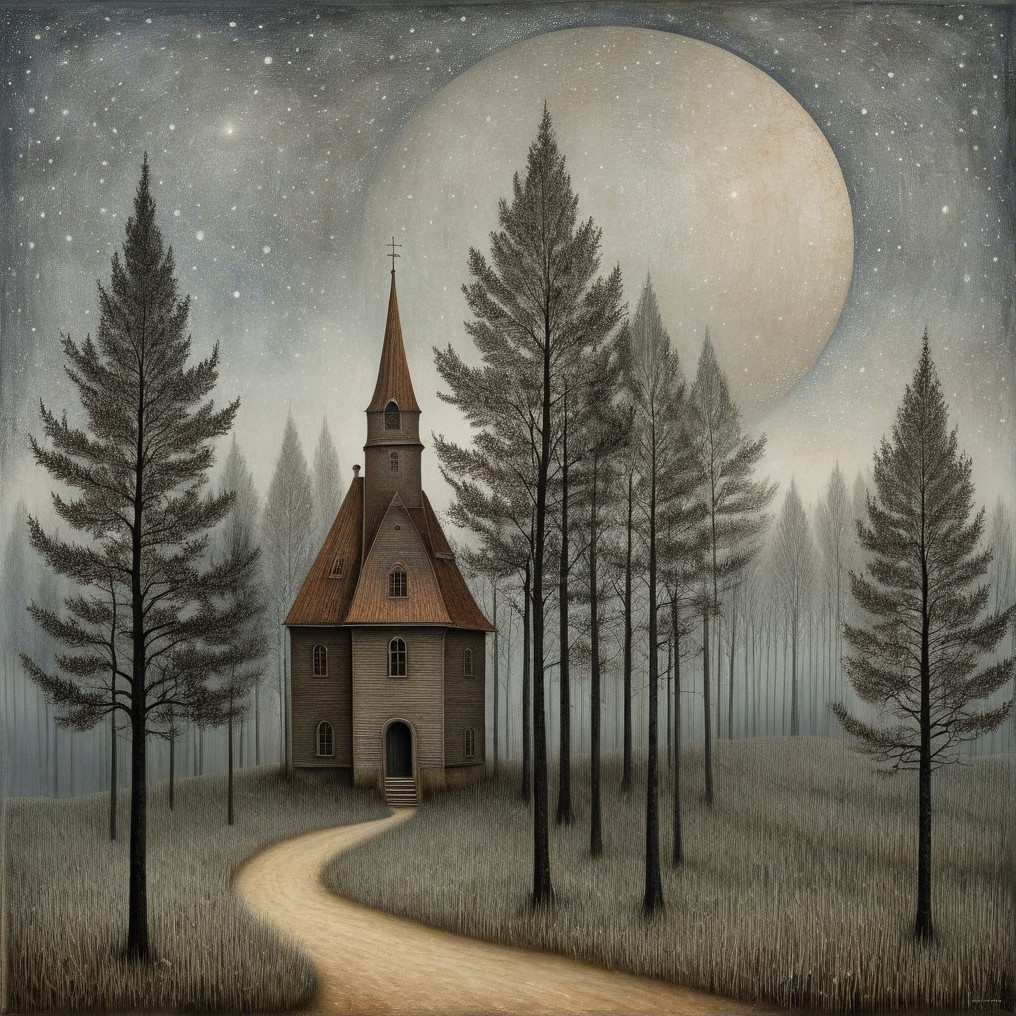 A whimsical, dark fairy-tale house stands tall on stilts, with pointed towers and a bright orange roof. A massive moon looms overhead, illuminating a winding path and surrounding trees.