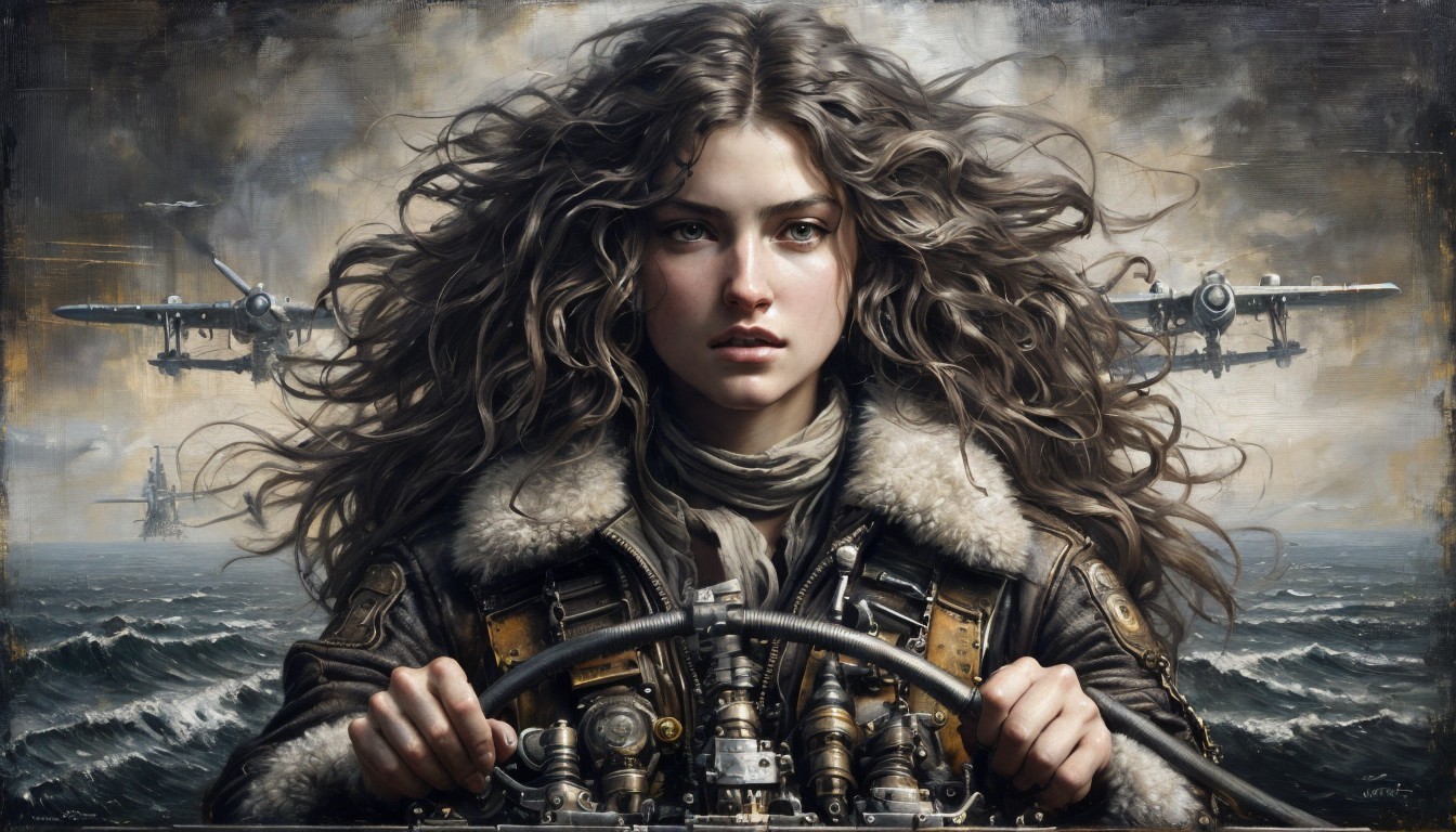 Prompt: Oppressive oil painting, wavy wild long haired young pilot girl 16 years old and subversive look, badass, controlling a steampunk spaceship, highly detailed illustration by Jeremy Mann, Alex Maleev, Pino Daeni and Liz Gael, masterpiece, 8k resolution, trending on artstation, rough texture, sharp focus, highly detailed intricate, masterpiece, best quality, official art, extremely detailed CG unity 8k wallpaper, highly detailed, absurdres, full body picture.