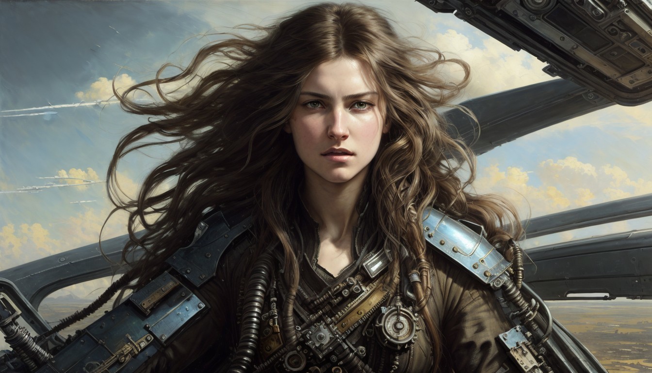 Oppressive oil painting, wavy wild long haired young pilot girl 16 years old and subversive look, badass, controlling a steampunk spaceship, highly detailed illustration by Jeremy Mann, Alex Maleev, Pino Daeni and Liz Gael, masterpiece, 8k resolution, trending on artstation, rough texture, sharp focus, highly detailed intricate, masterpiece, best quality, official art, extremely detailed CG unity 8k wallpaper, highly detailed, absurdres, full body picture.